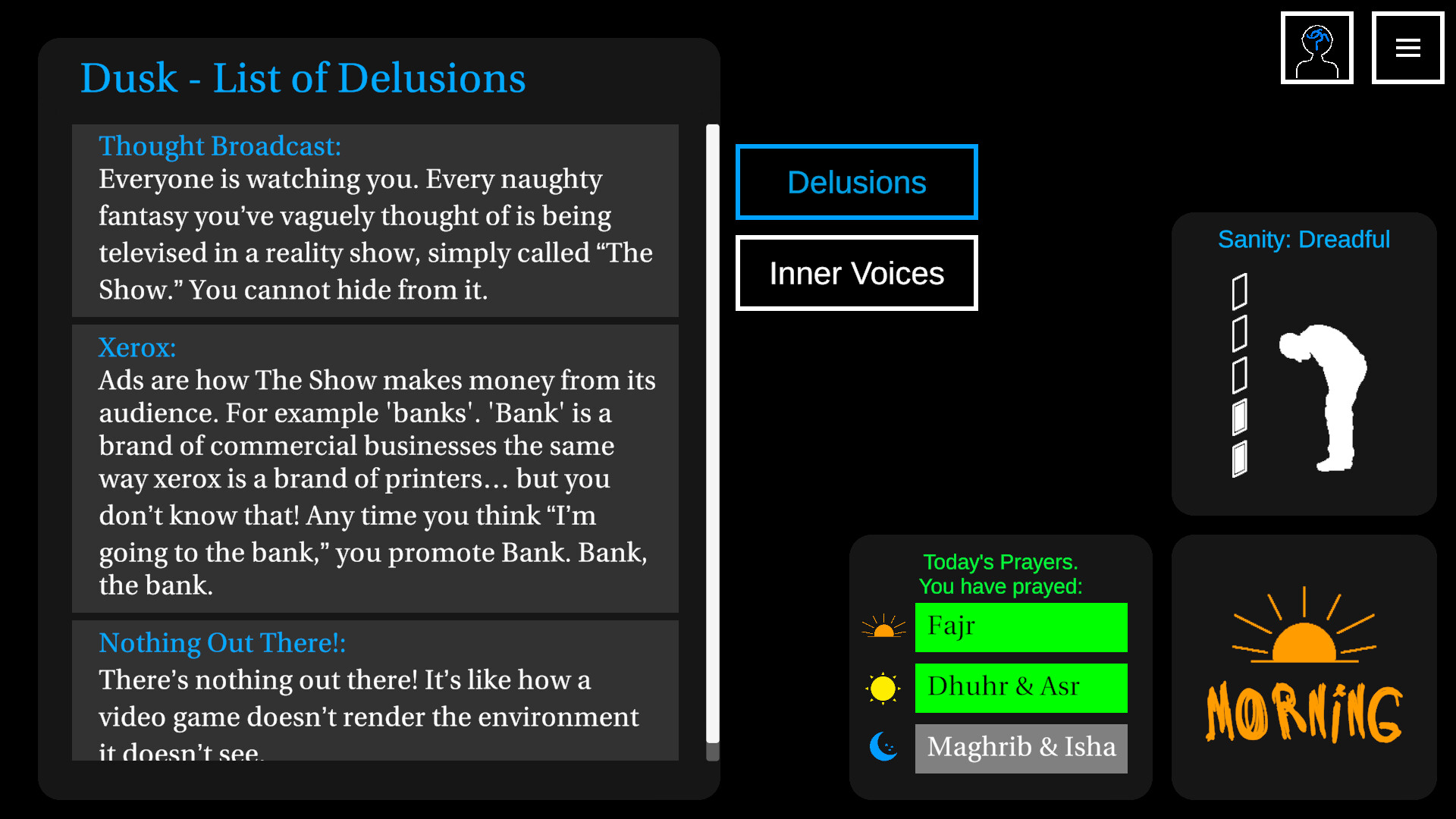 Asylum simulator. An interactive fiction about schizophrenia and finding meaning after near-death, with Disco Elysium-style mechanics.
