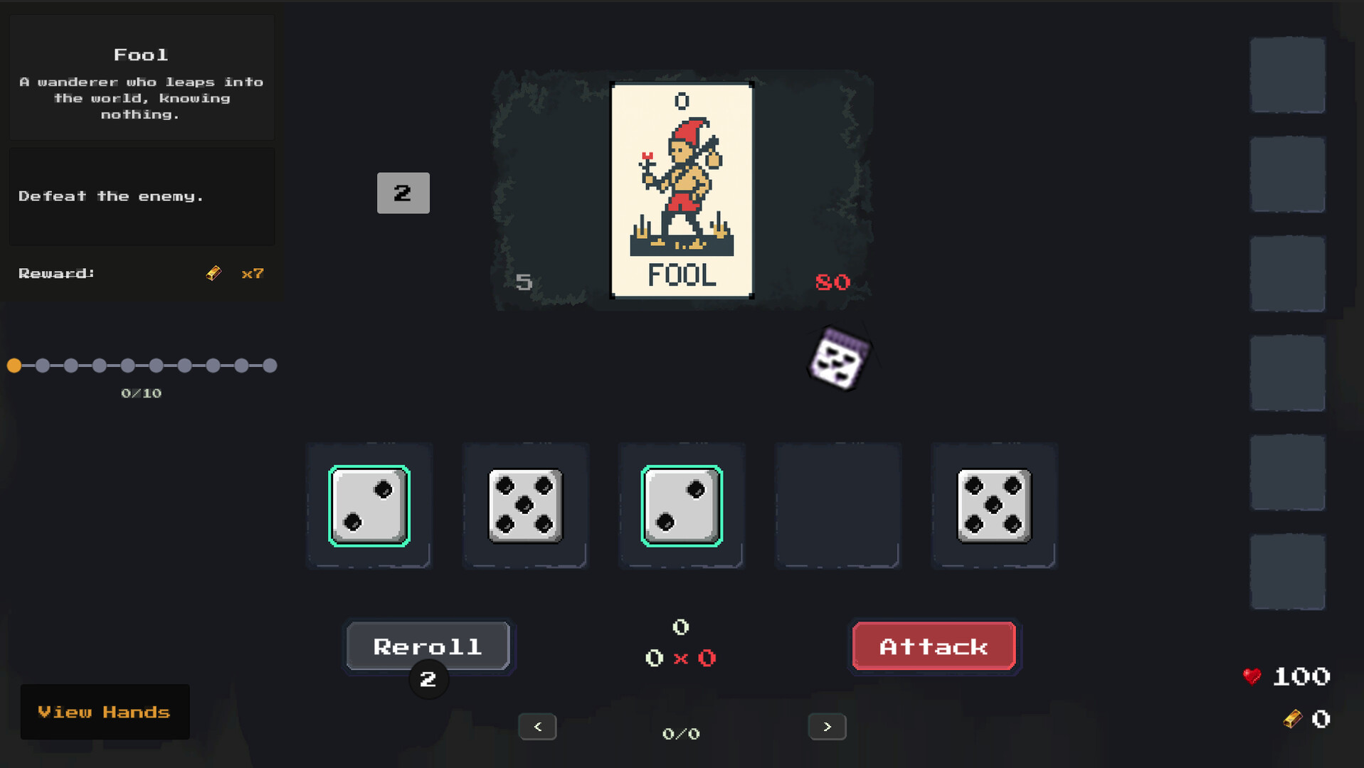 A Balatro-like deck-building strategy battler built on Yacht dice hands. Weigh odds, manage rerolls, and chain rune effects to defeat Tarot-inspired enemies. Roll the dice and resist fate.