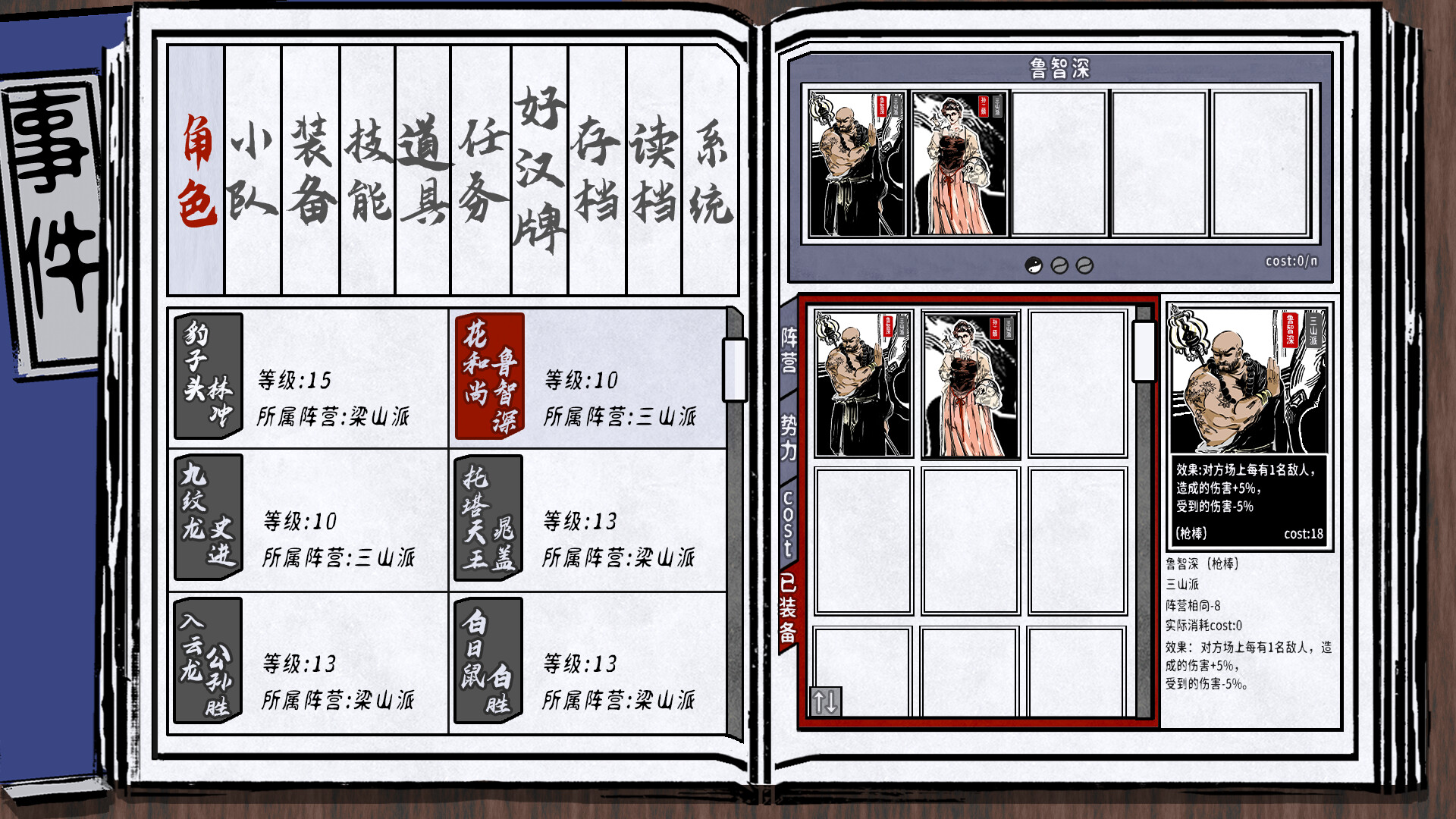 在遊戲中,玩家可以通過參與不同梁山好漢的故事,如林沖、武松、魯智深等...與梁山好漢們結識,在達成一系列條件後,也可以提升好感度,最終與好漢組隊