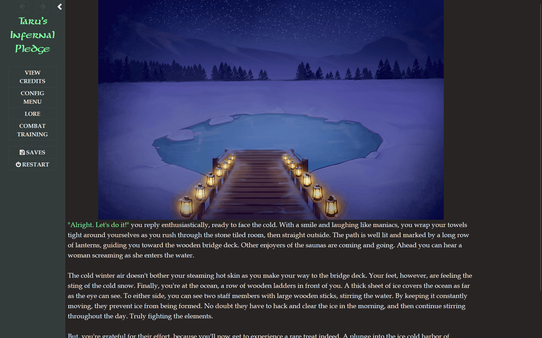 Taru's Infernal Pledge is a text-based adventure with digitally hand-drawn backgrounds and lewd art for all sex scenes. It focuses on consensual BDSM throughout the game, while delivering a dark and deep story that delivers shocking revelations of the otherworldly forces acting upon the world. Follow the events of the current timeline where Taru gets into trouble everywhere she goes. Her objectives: Find out who betrayed her and get her revenge, free her soul from the dark force that has claimed it, and free her body from her pledge to the demon, while honoring the terms of her deal. In parallel, follow the flashback events before her current predicament, where she and her gang take on the biggest heist of their careers, and witness the aftermath that saw her world turn upside down. In both the current timeline and the flashbacks, your choices matter and shape the story that unfolds.
