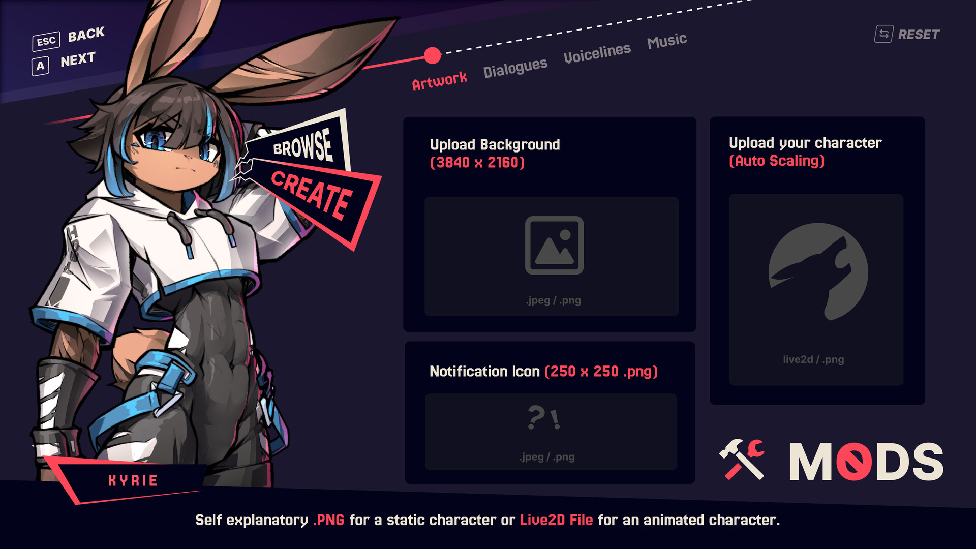 Upload a .csv of custom voicelines and pair them with your own audio recordings to give your character a real voice in game. View and share mods on our community Discord!
