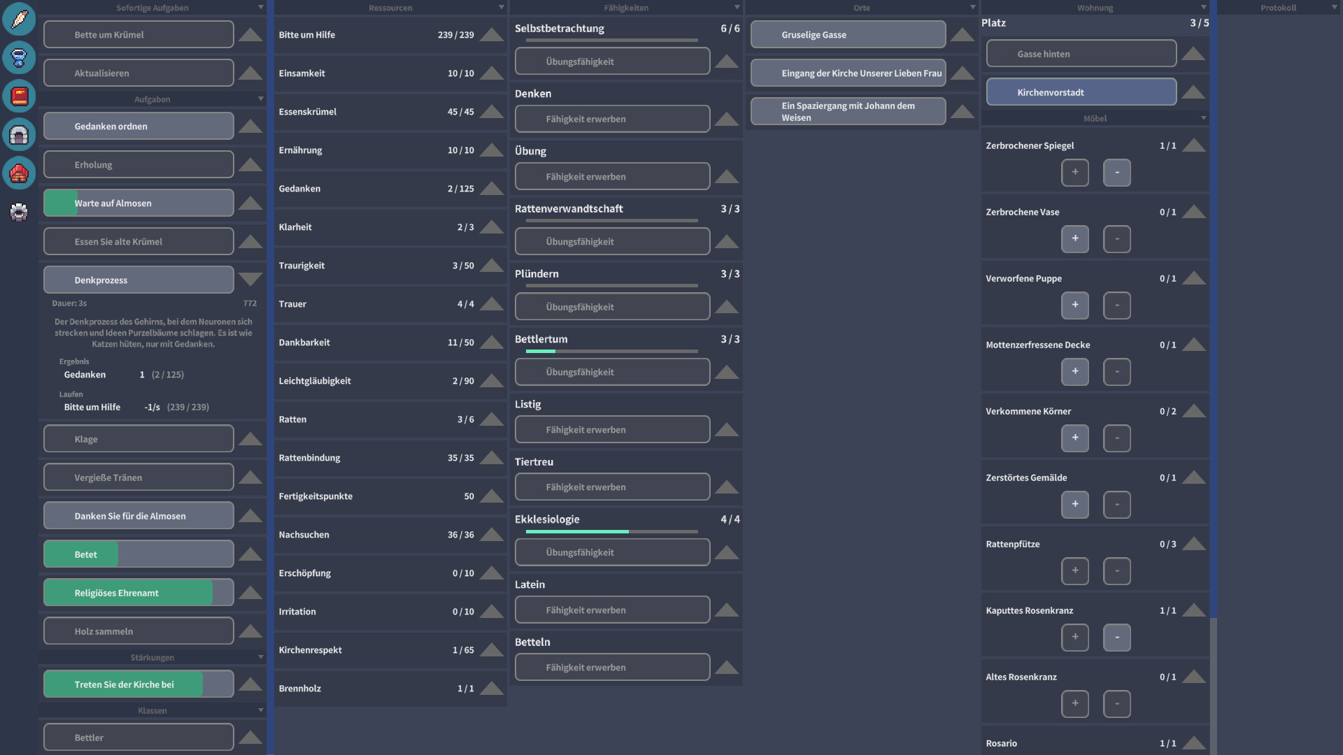 • Steige durch die Klassen auf: In Beggar’s Life wählst du zu Beginn keine Klasse. Stattdessen schaltest du sie im Laufe des Spiels frei, indem du eine wählst, wenn du die Anforderungen erfüllst. Klassen sind mehrstufig und wachsen im Umfang. Du könntest am unteren Ende der Straßen beginnen und dann der Kirche als Almosensammler dienen. Mach weiter, und du könntest ein Akolyth oder sogar ein Priester werden. Oder vielleicht änderst du mitten in deinem Leben in der Kirche den Weg. Ziehe in die Kanalisation und werde ein Rattenwächter. Oder ein Taschendieb. Oder ein Straßenphilosoph. Die Wahl liegt bei dir, wenn du es dir verdienen kannst.