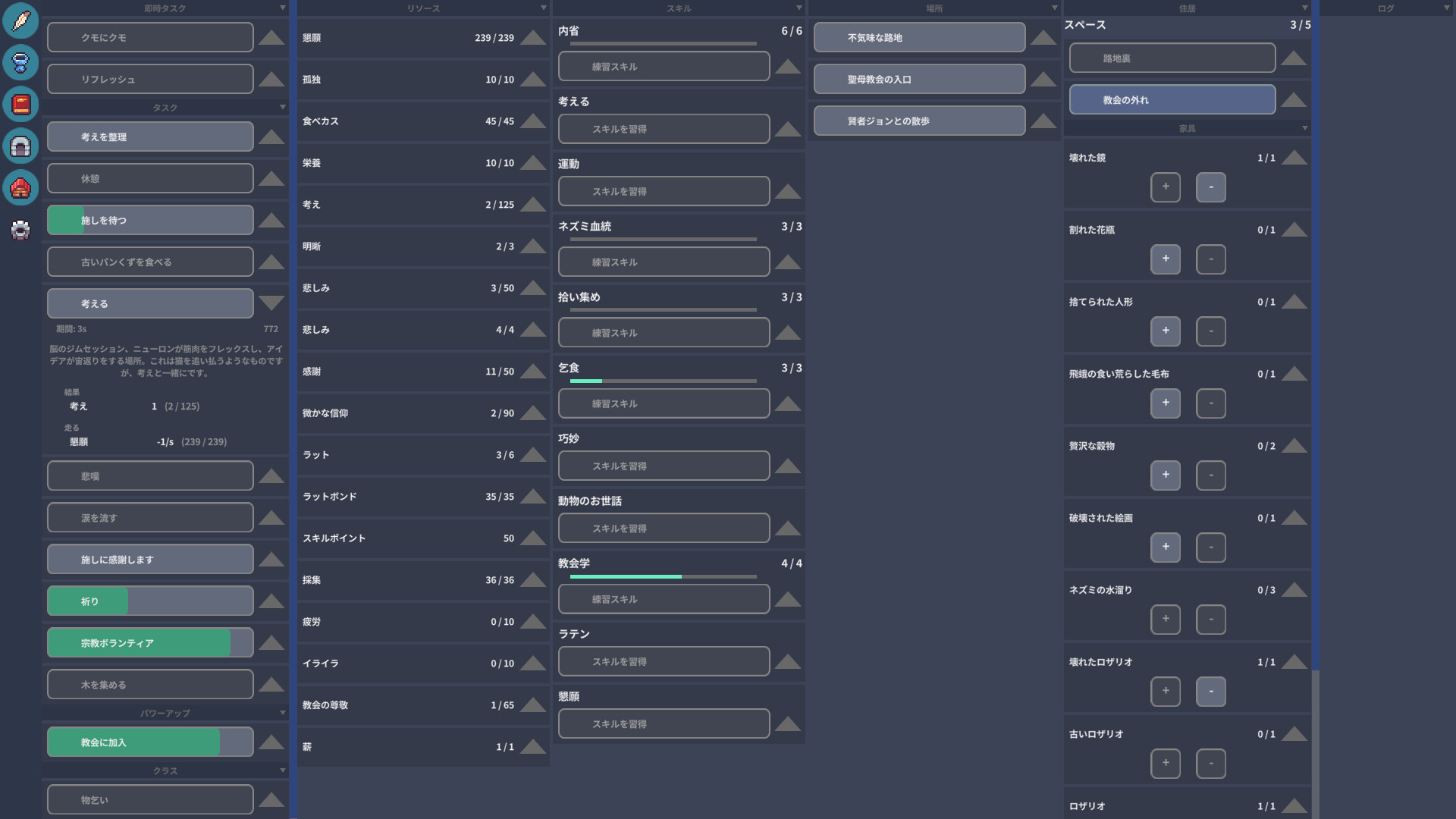 • あらゆるものを蓄積する: 集めるべき資源は多く、集める方法も多様です。食べ物を乞い、飾り物を探し、許しを祈り、想像して具現化させる。資源は、パンくずのように具体的なもの、猫のように生きたもの、あるいは悲しみや感謝のように抽象的なものです。