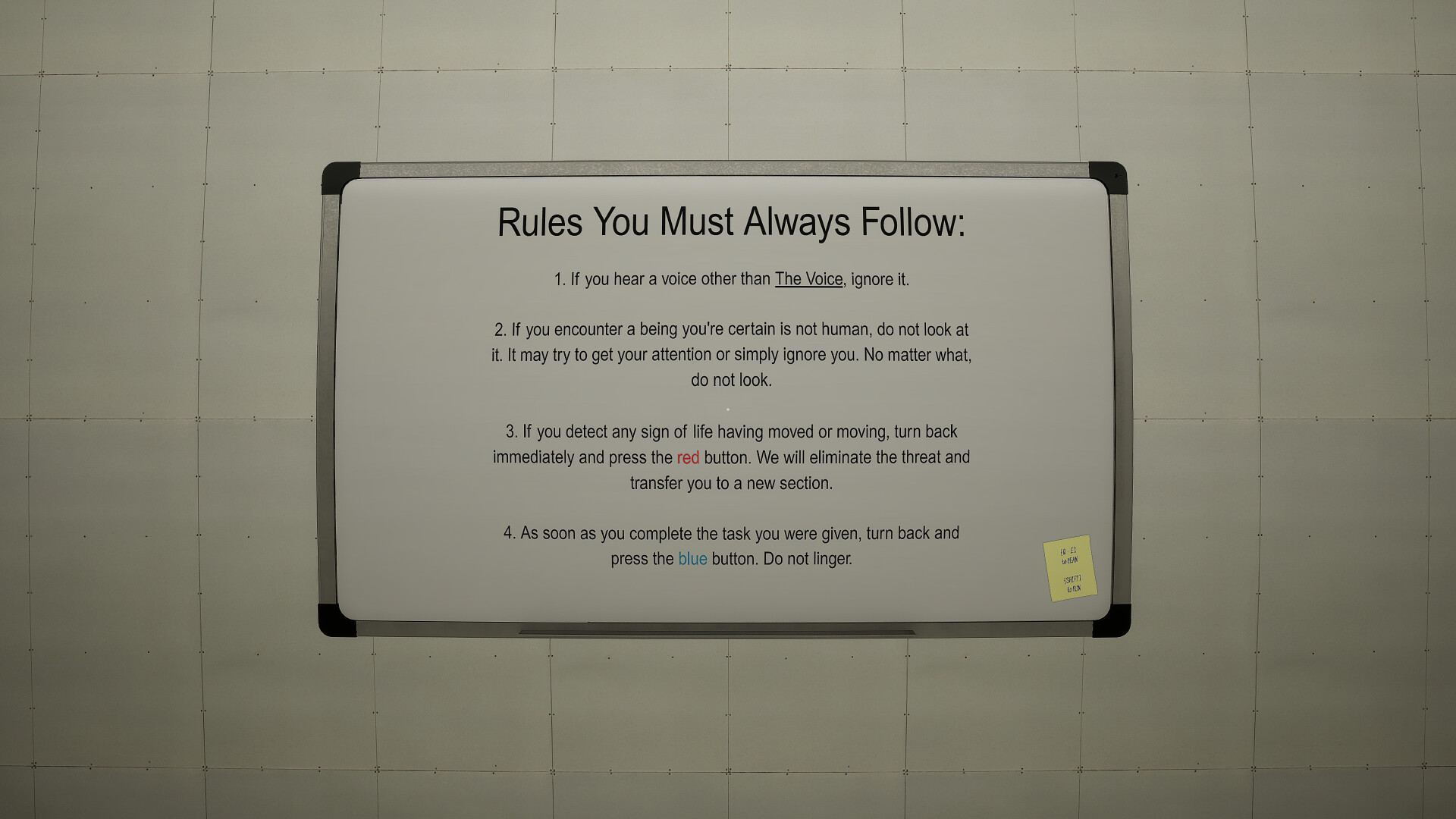 3. If you detect any sign of life having moved or moving, turn back immediately and press the red button. We will eliminate the threat and transfer you to a new section.