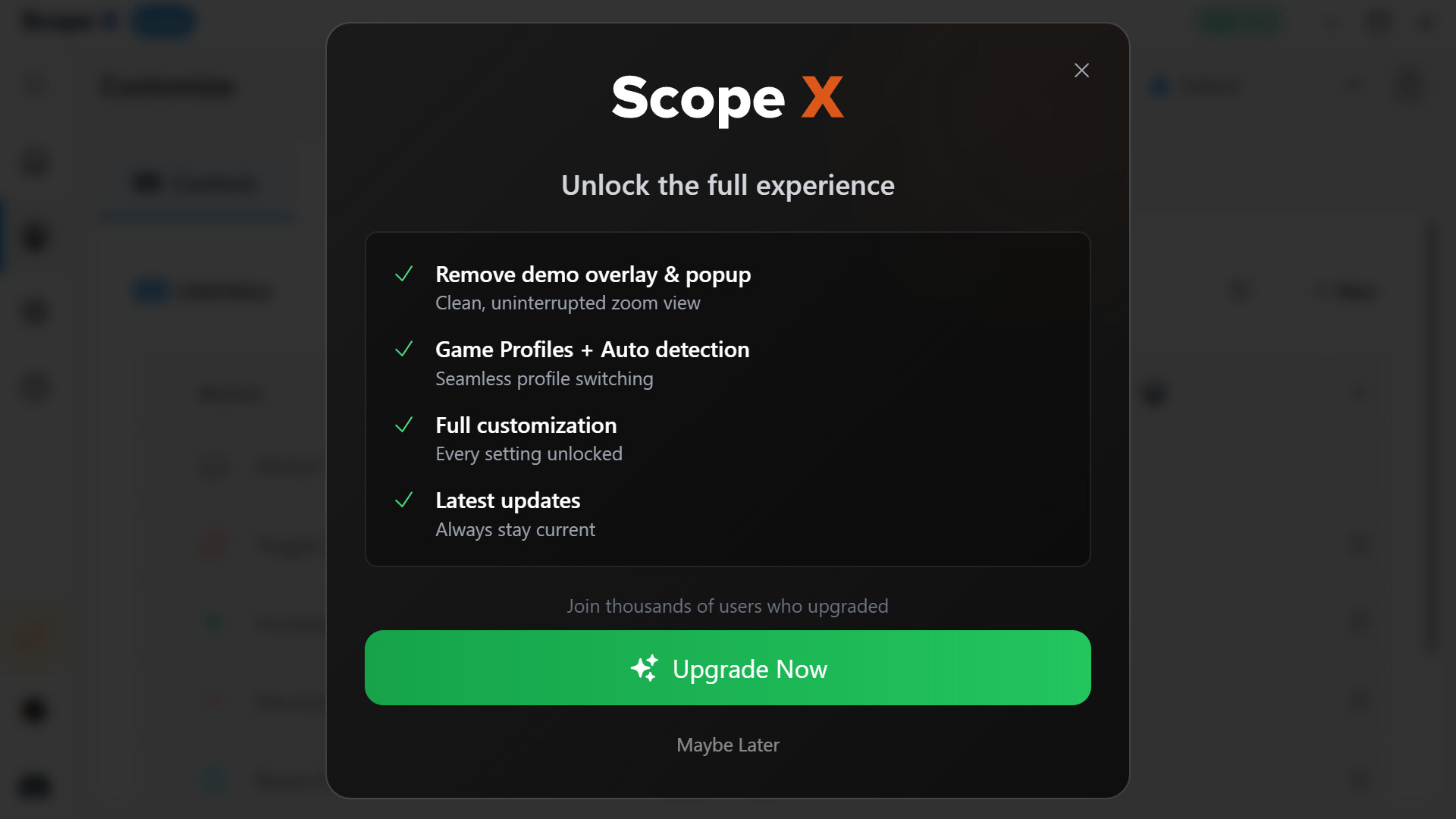 Tüm özellikleri ve özelleştirme seçeneklerini açmak için tam Scope X uygulamasına yükseltin.