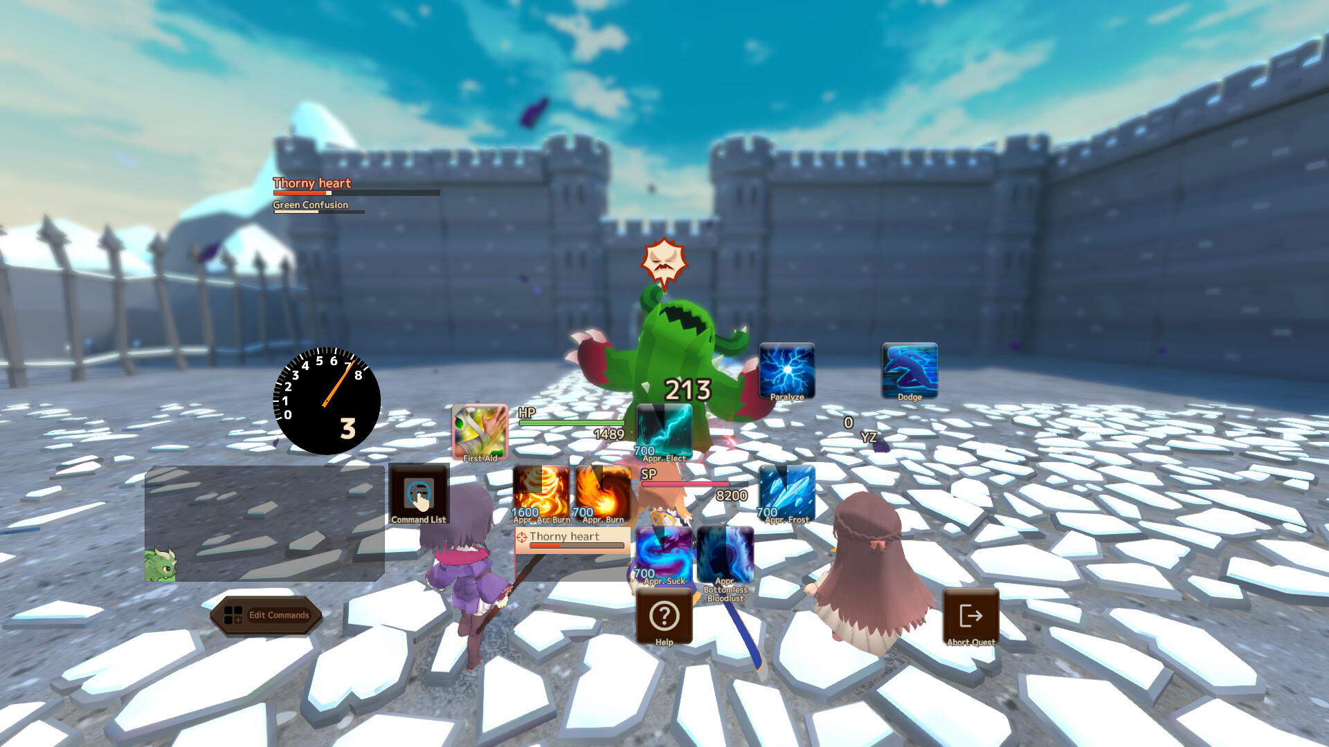 For instance, putting an “HP Gauge” beside a skill command lets that skill heal a small amount of HP whenever it’s used.