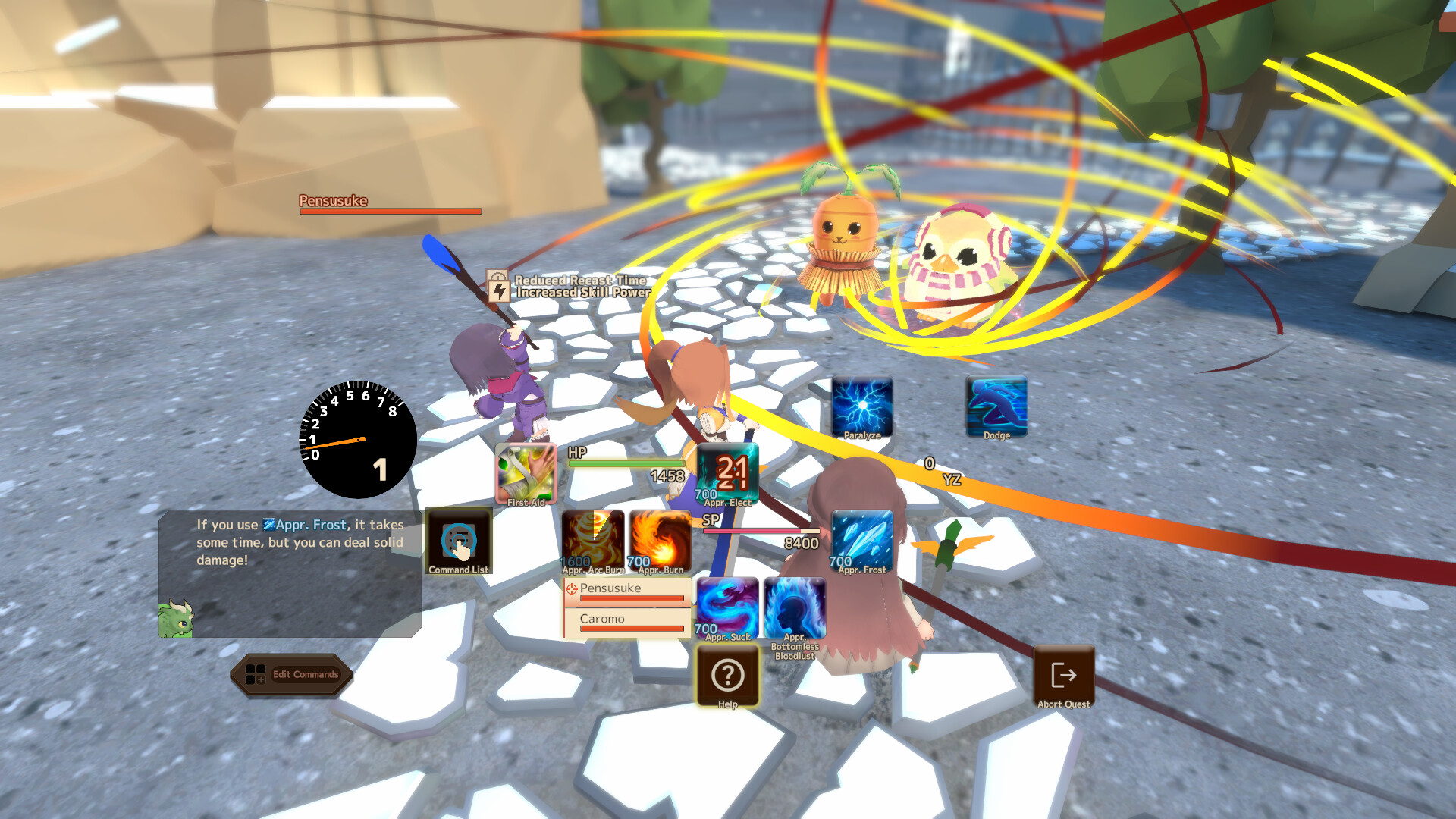 For instance, putting an “HP Gauge” beside a skill command lets that skill heal a small amount of HP whenever it’s used.