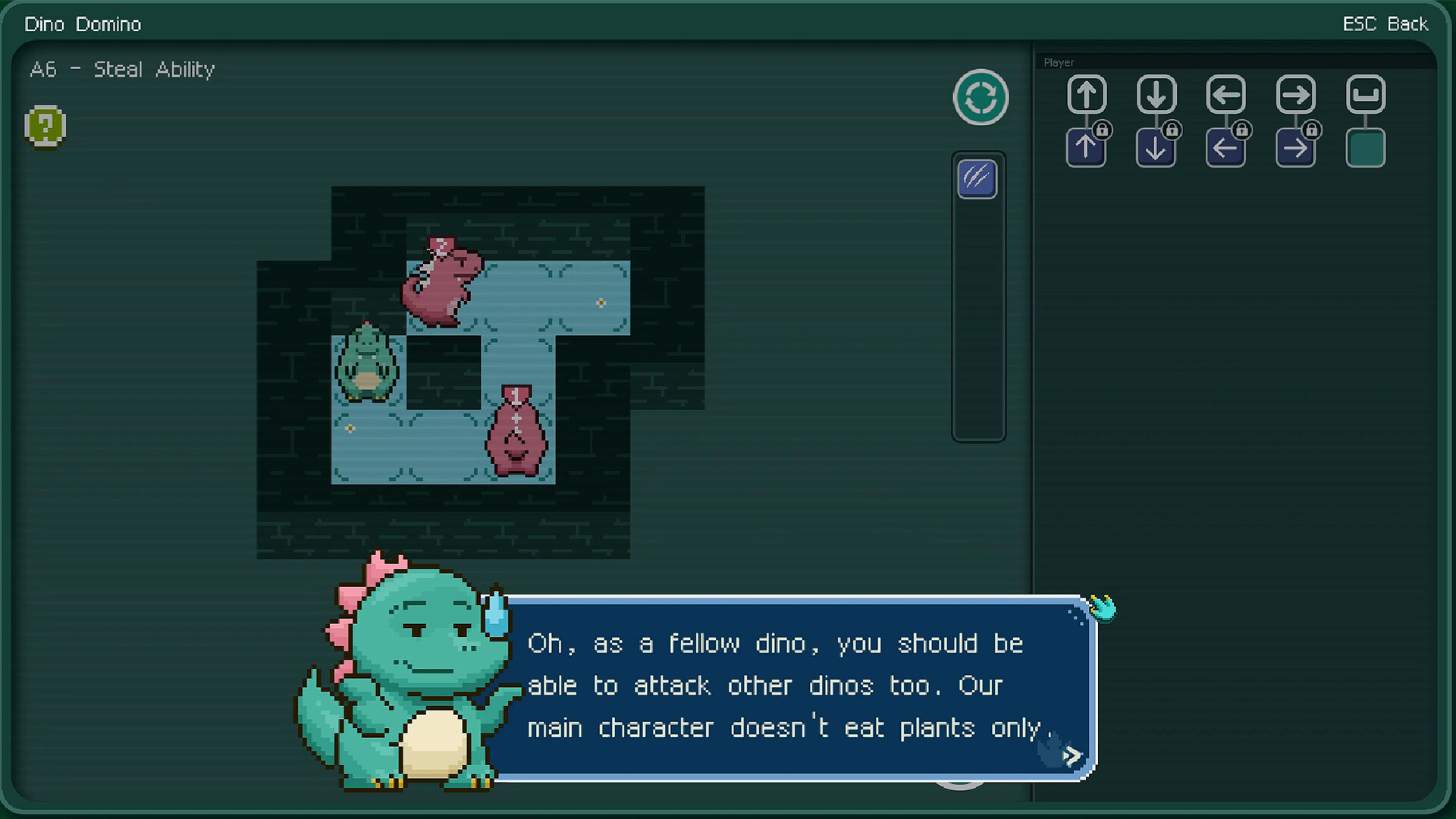 Dino Domino is a pixel-art puzzle game mixing pseudo-programming with turn-based battles.