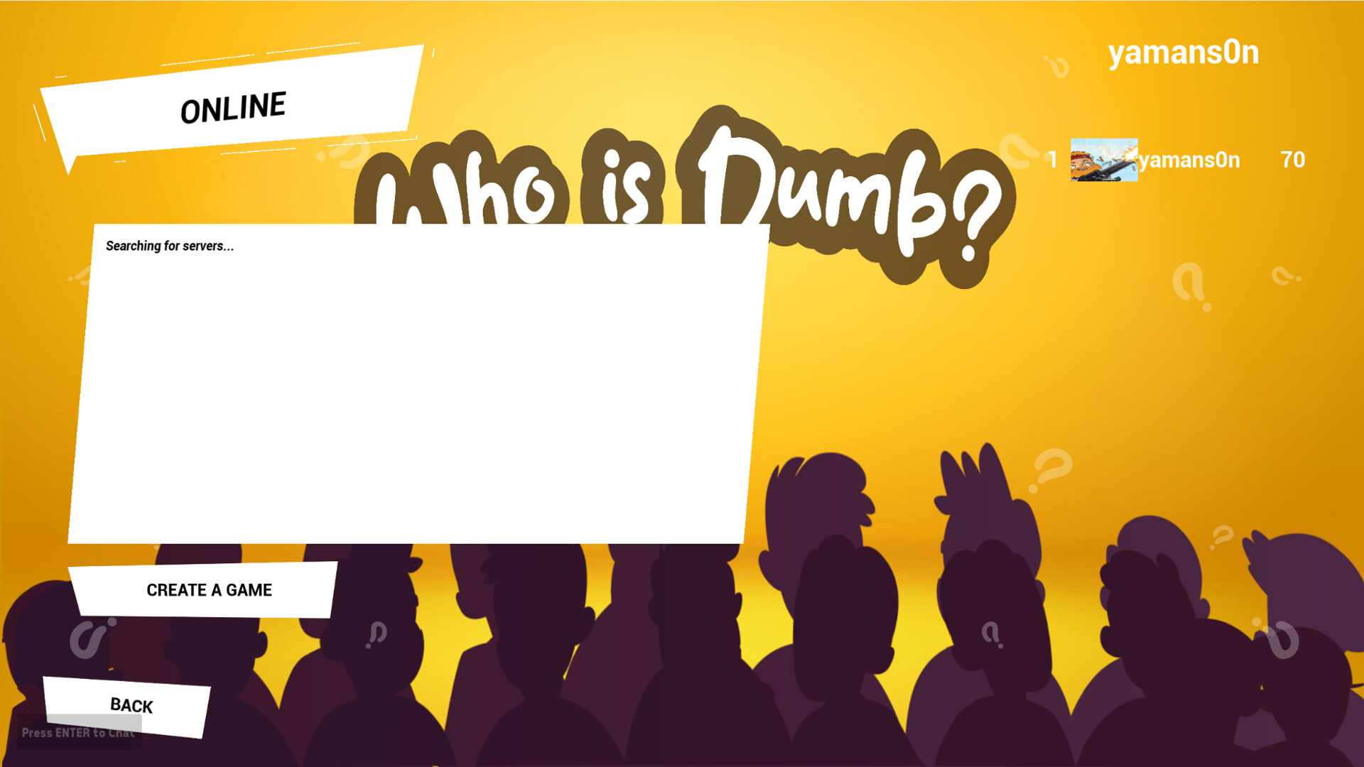 Who is Dumb? is a fun multiplayer trivia quiz game! Play with 1–8 players, test your knowledge, compete with friends, and climb the leaderboards. Don’t finish last… or you’ll be the dumb one!