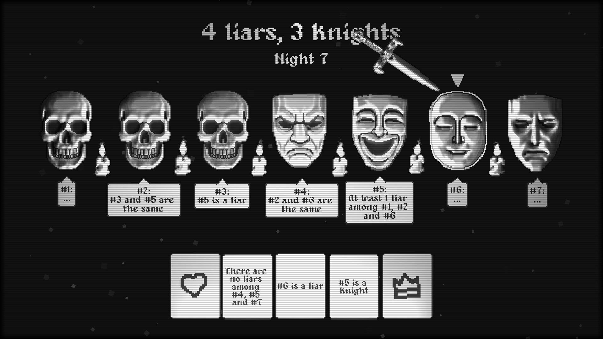 In a candle-lit hall, a small group of NPCs trade cryptic statements about each other. Some tell the truth. Others weave lies. Your task is to listen carefully, analyze the contradictions, and execute every liar before they execute you.