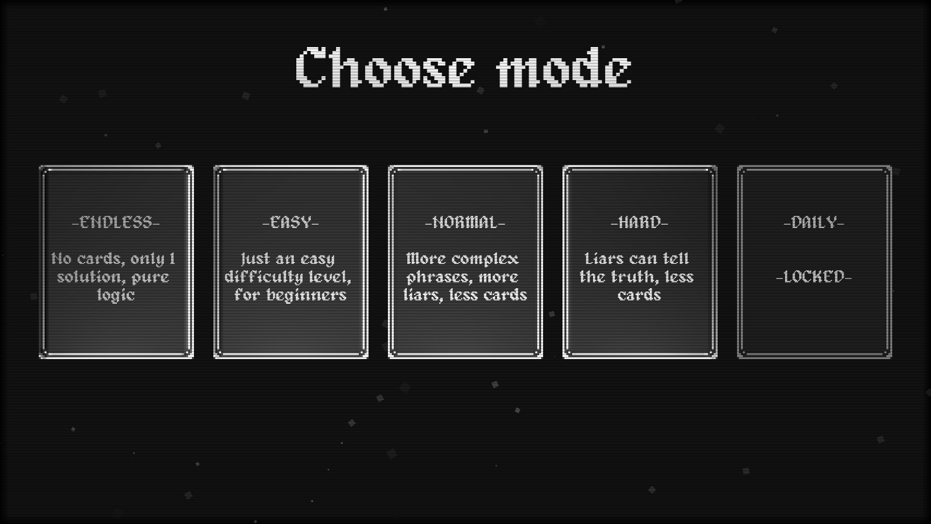 With each run, the cast changes, the lies shift, and the challenge grows. Procedurally generated logic puzzles ensure no two games are the same. The black-and-white aesthetic, eerie masks, and haunting ambient soundscape create an atmosphere of tension and mistrust.