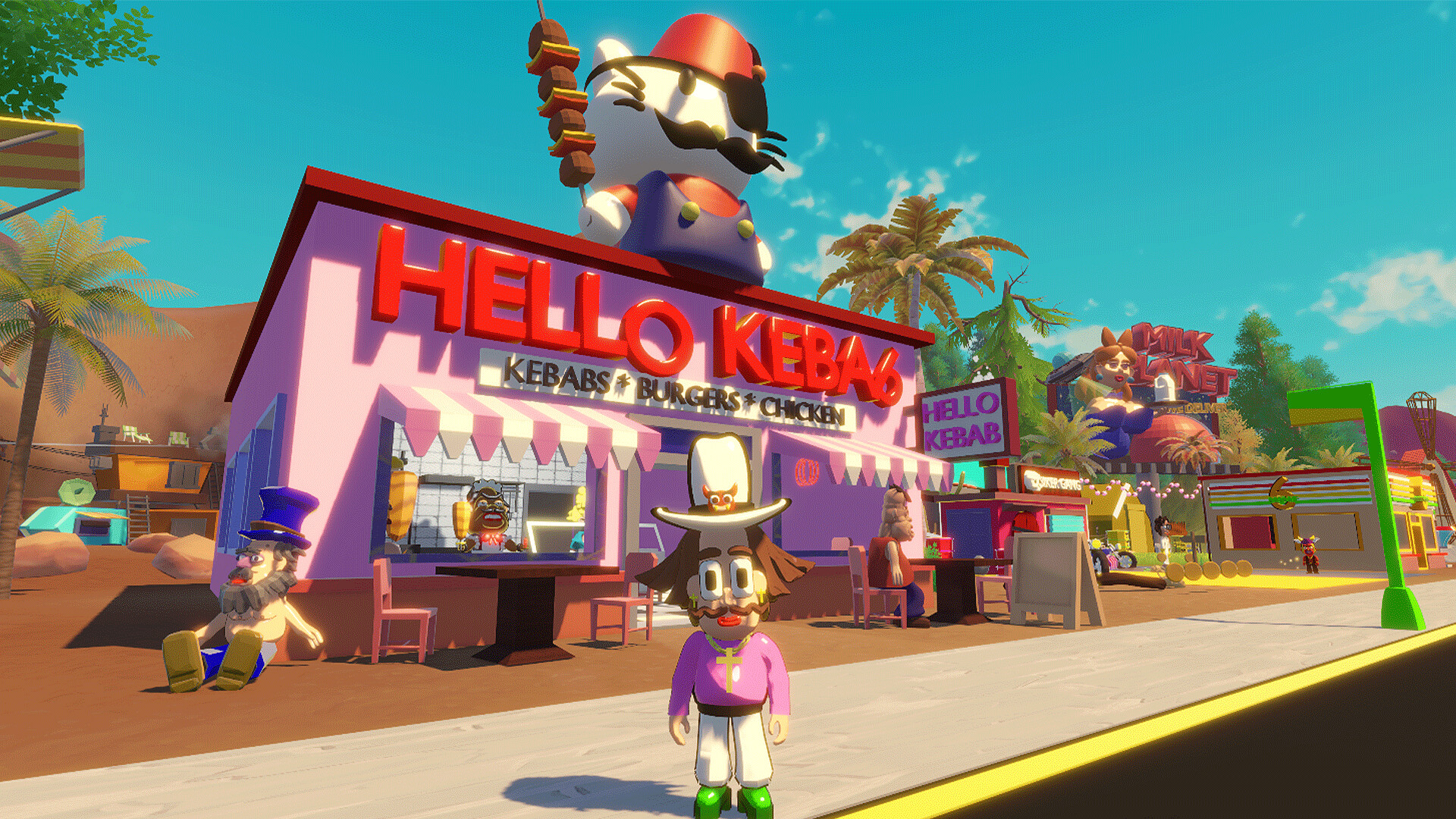 Ravy Davy is a chaotic 3D adventure game where you play as a washed-up rockstar trying to save the broken town of Ambiguity. Fight biker gangs, infiltrate satanic cults, collect kebabs, uncover a surreal conspiracy and take down OAP Margaret Doom! — all in a lo-fi cartoon world full of dark humour and deranged characters.