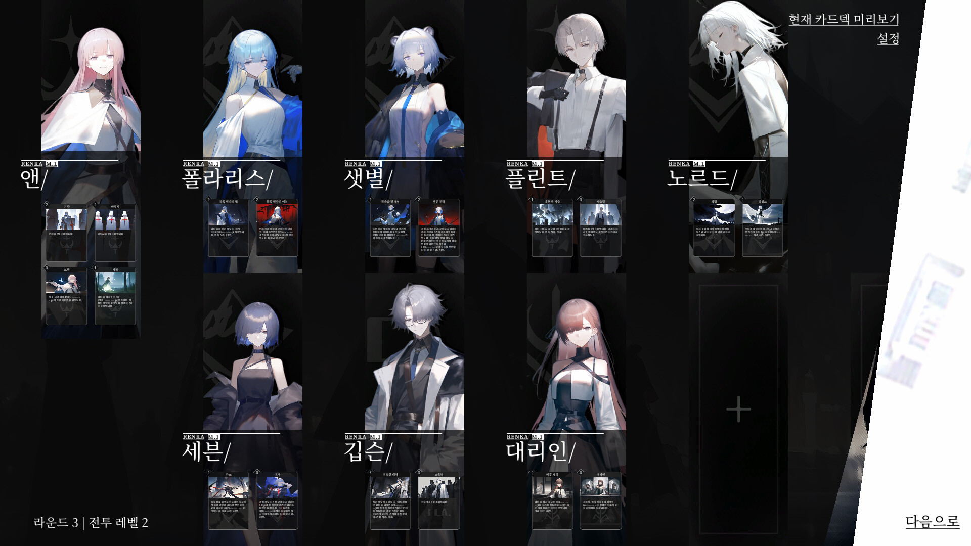 각 캐릭터는 독립적인 카드 시스템과 육성 루트가 존재합니다.