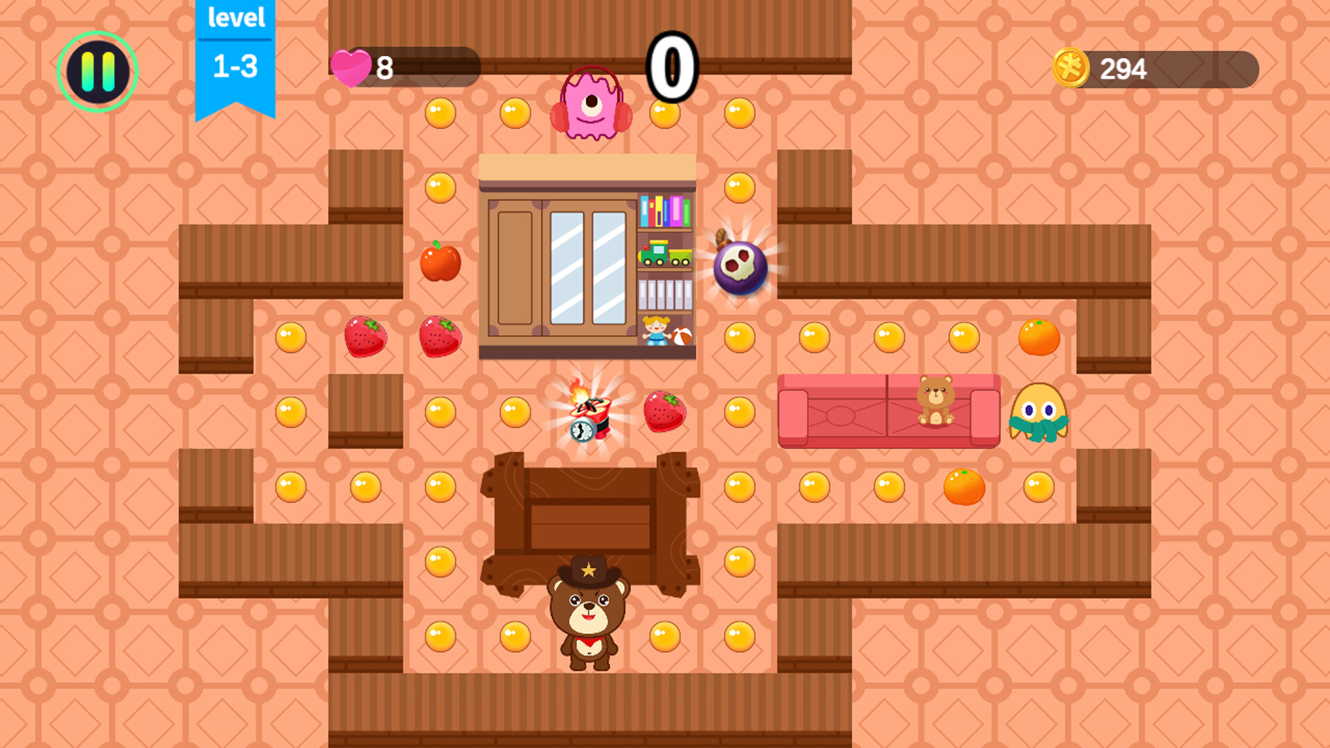 Competitive mode: You can compete with your friends on the same stage here to see who can earn points before their lives are exhausted. Each player starts with 4 lives and can earn points by defeating monsters and eating beans.