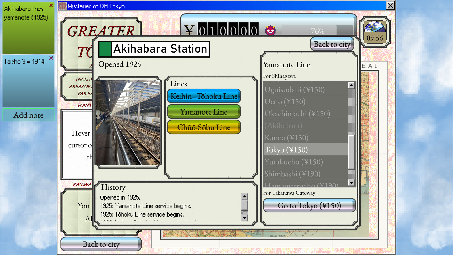 As an agent for Rare Item Acquisitions, you'll come to know Tokyo like the back of your hand. As you explore, plot the best routes using Tokyo’s historical train networks to save time and money. Your expense account is not bottomless!