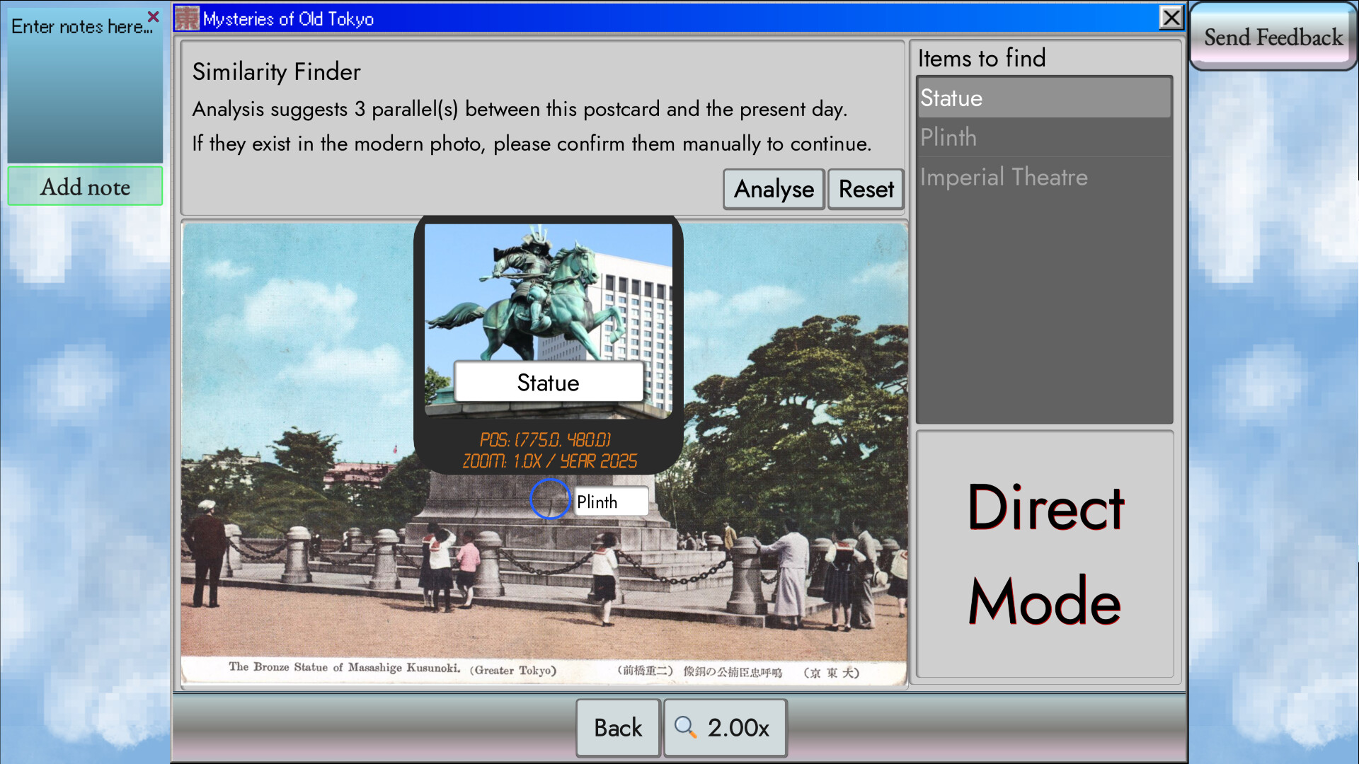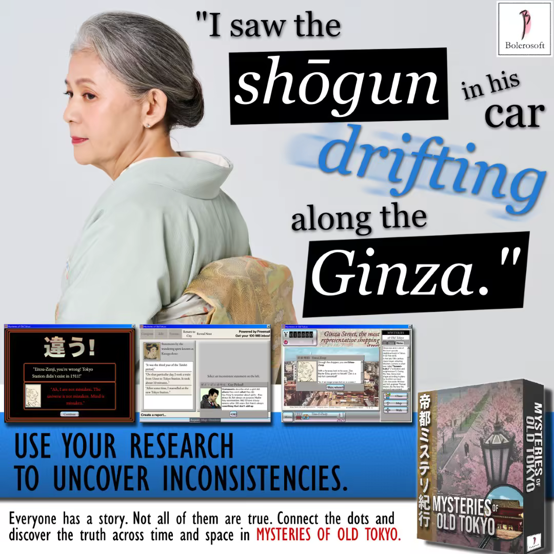 Inspired by the CD-ROM "multimedia experiences" of the 1990s like Encarta '96 and Cosmology of Kyoto, as well as modern detective games like The Roottrees are Dead and the Golden Idol series, Mysteries of Old Tokyo takes a set of postcards printed in 1930s Tokyo from the author's collection and brings them, hand-scanned, to your personal computer in full 1024x768 resolution.