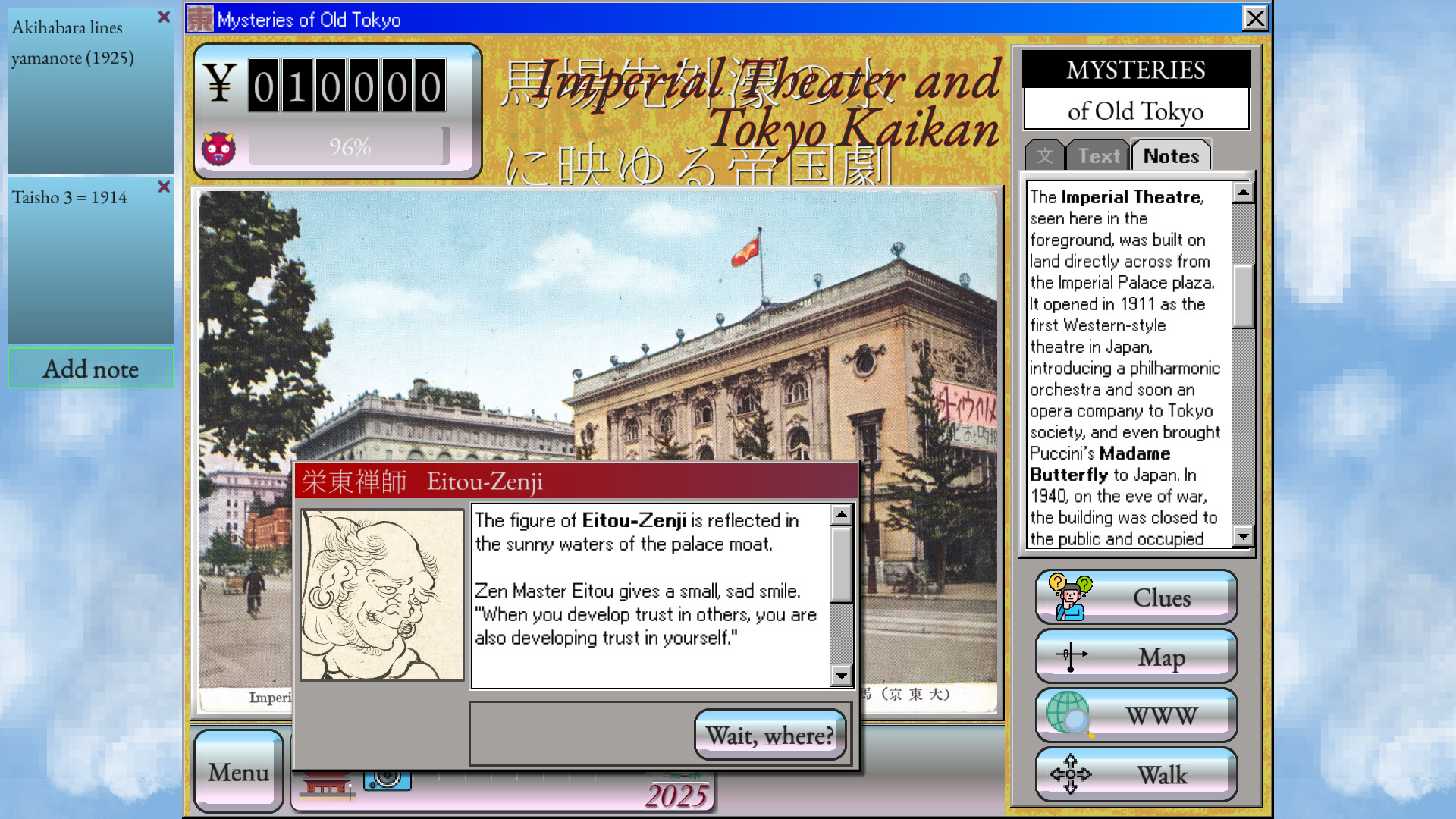 Inspired by the CD-ROM "multimedia experiences" of the 1990s like Encarta '96 and Cosmology of Kyoto, as well as modern detective games like The Roottrees are Dead and the Golden Idol series, Mysteries of Old Tokyo takes a set of postcards printed in 1930s Tokyo from the author's collection and brings them, hand-scanned, to your personal computer in full 1024x768 resolution.