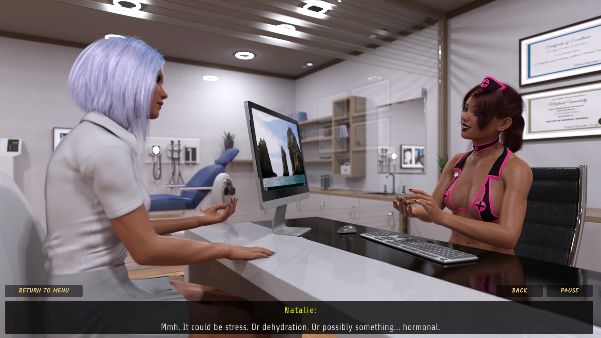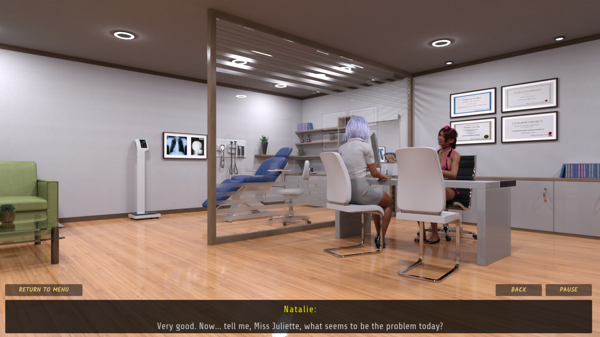 Enjoy an erotic visual novel featuring two hot women and an engaging sex simulator. Juliette and Natalie sneak into an unused doctor's office to play out one of their wild fantasies. A naughty nurse and patient sex game in the right setting.