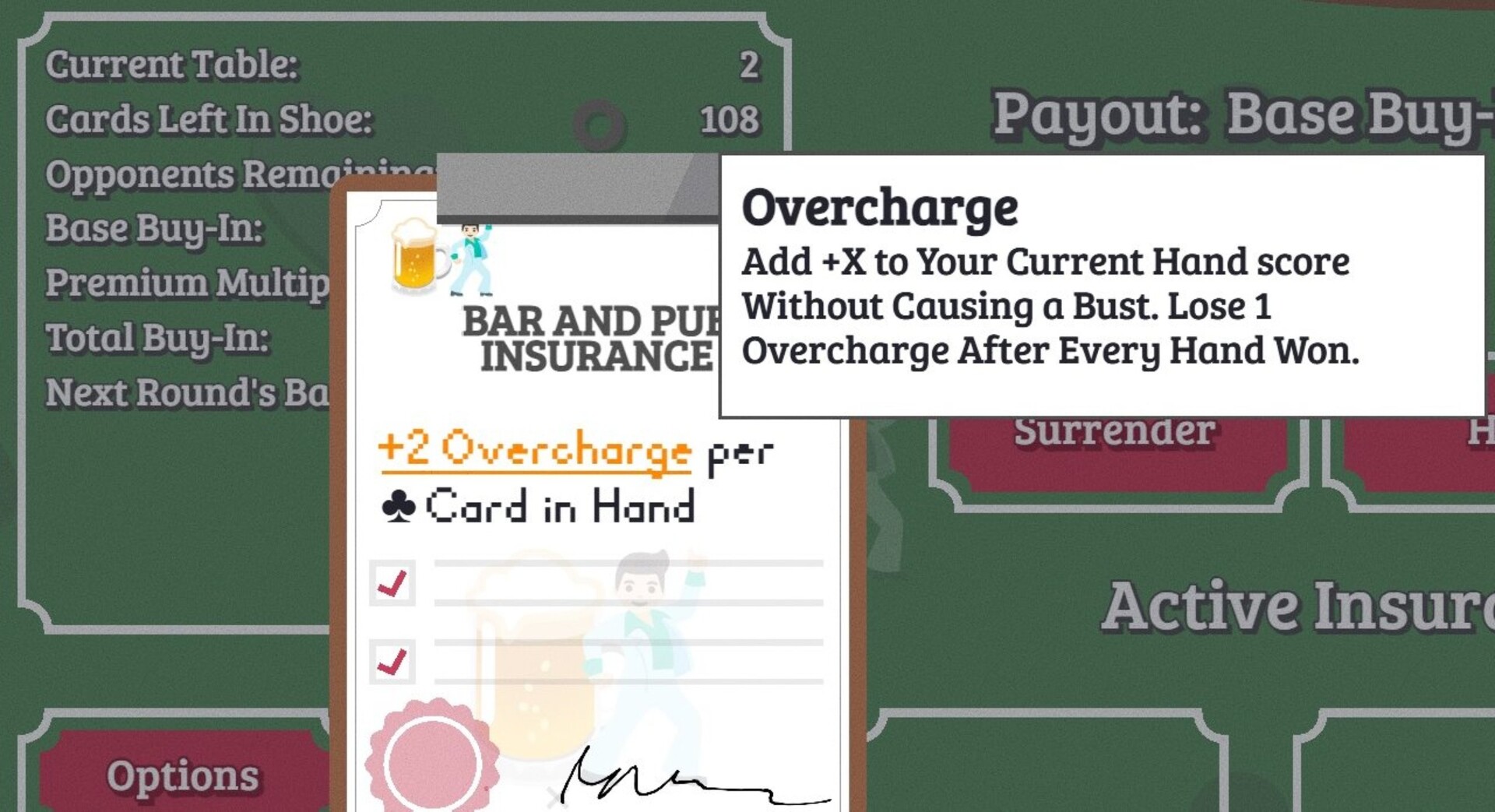 Blackjack rogue-like with a Roulette "Spin". Purchase Insurance Policies that provide unique abilities that give you the edge while you take on larger wheels with even larger Buy-Ins.