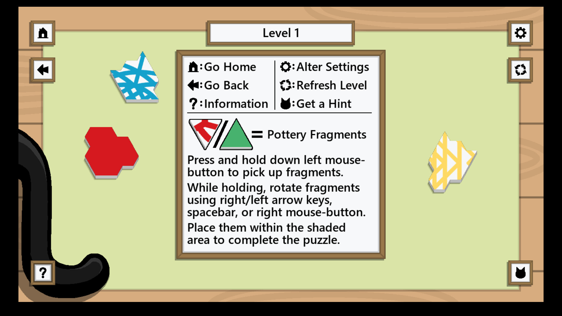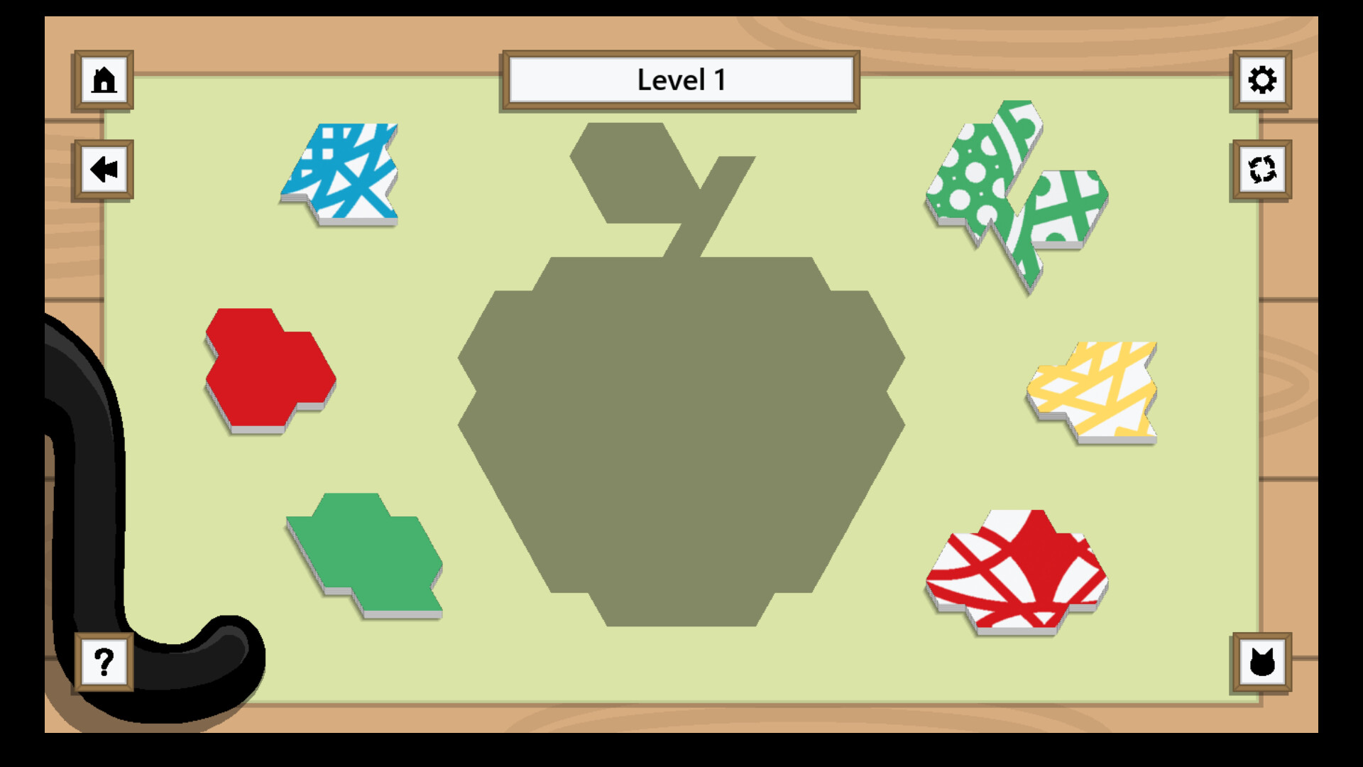 You begin thoughtfully rotating and placing the pieces. You choose the biggest pieces first and start from the corners. Remember to alternate colours. Some of the shapes fit together perfectly. But you get stuck. Mr Stitches purrs. He gives you a clue. You place the final piece. He takes care of the rest. The shadows dance around you both.