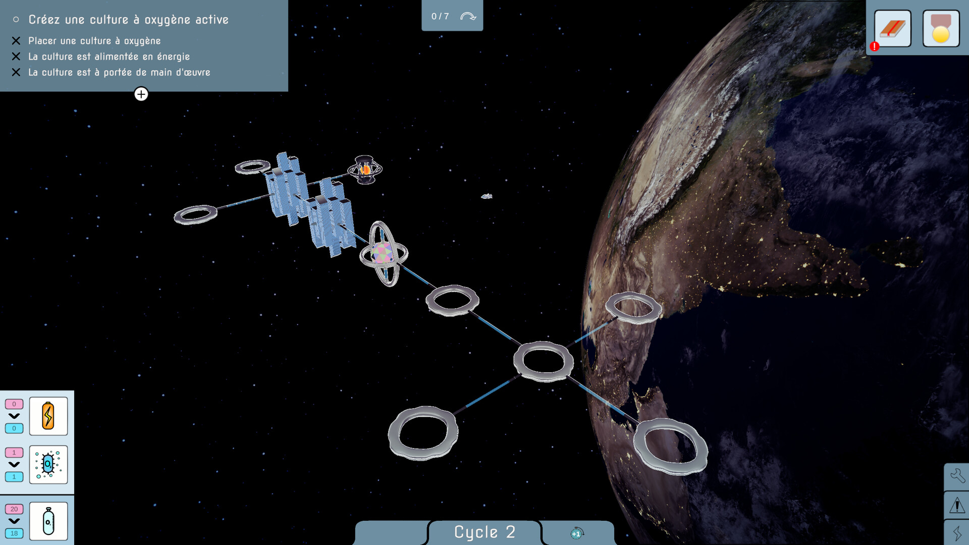 Vous incarnez un directeur de station spatiale, chargé de prendre les décisions cruciales au déroulement des missions de colonisation envoyées explorer l'espace. Seul maître à bord, vous devrez concevoir et installer des stations intelligemment, prenant en compte les contraintes temporelles et spatiales de chacune de vos missions. Installerez vous en priorité des cultures à oxygène, vous assurant de ne pas manquer de cette ressource inestimable, ou choisirez vous de déployer avant tout votre industrie pour commencer au plus tôt la production du module crucial pour votre mission ?