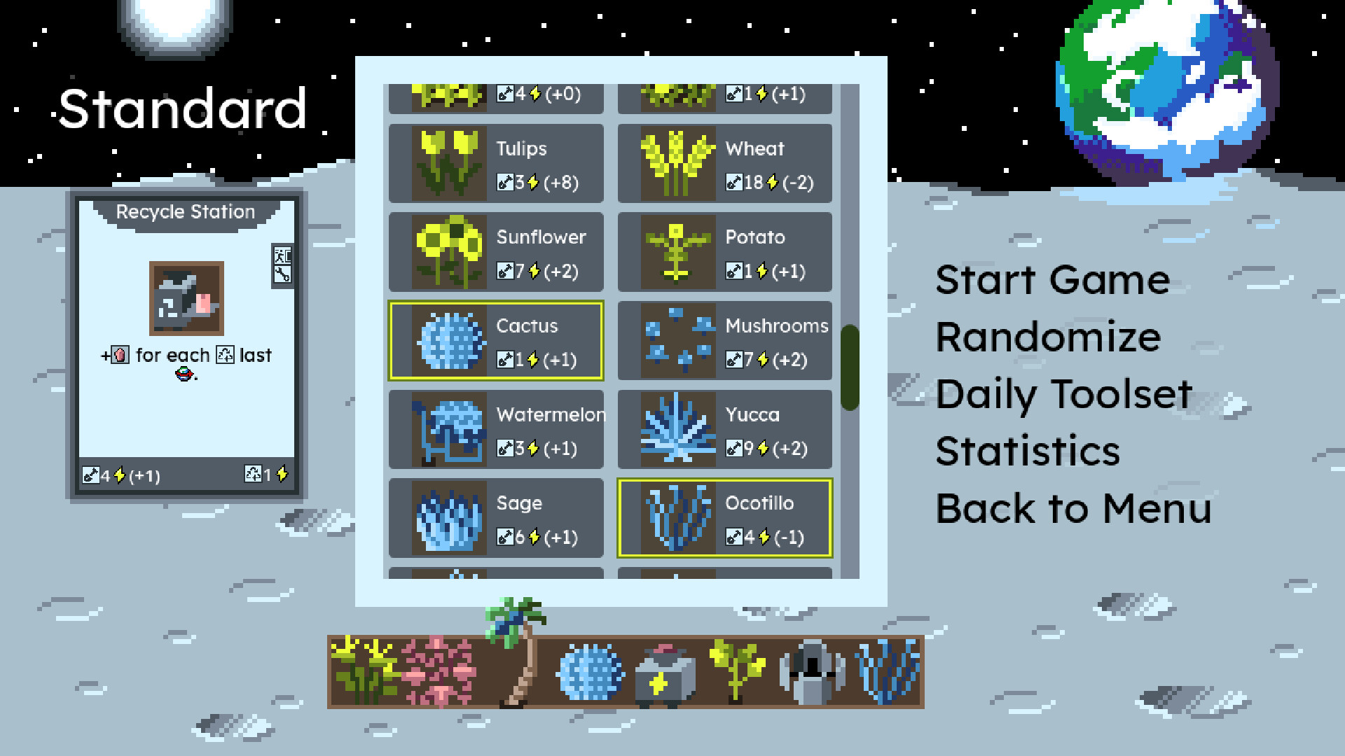 Moon Garden Optimizer is a puzzle strategy game about generating oxygen for a moon habitat while conserving as much water as you can.  With the power of unlimited undo, you can retry until you're satisfied with your own score.