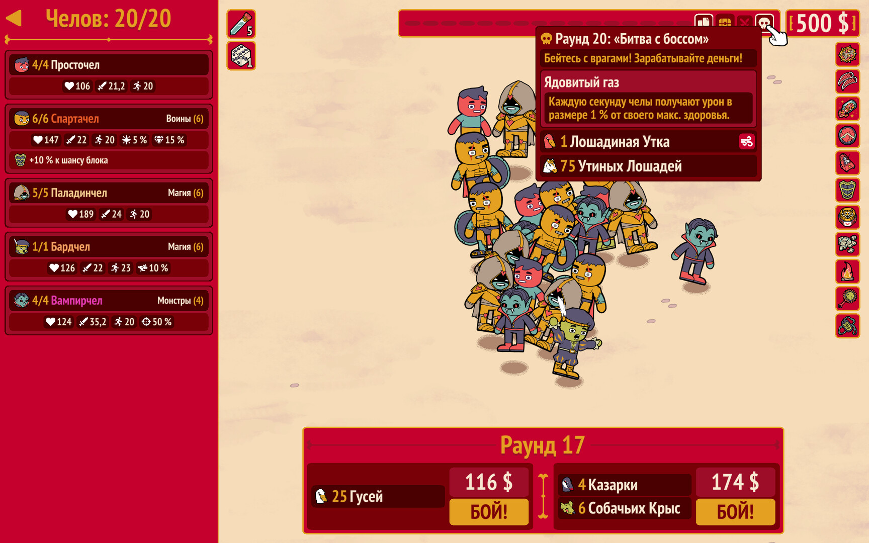 Рогалик-автобаттлер, в котором вы собираете армию челов. Сколько челов нужно, чтобы победить гориллу? А тысячу карапузов? А утку размером с лошадь? А древнего БОГА? Зайдите на Ранчо и узнайте сами.