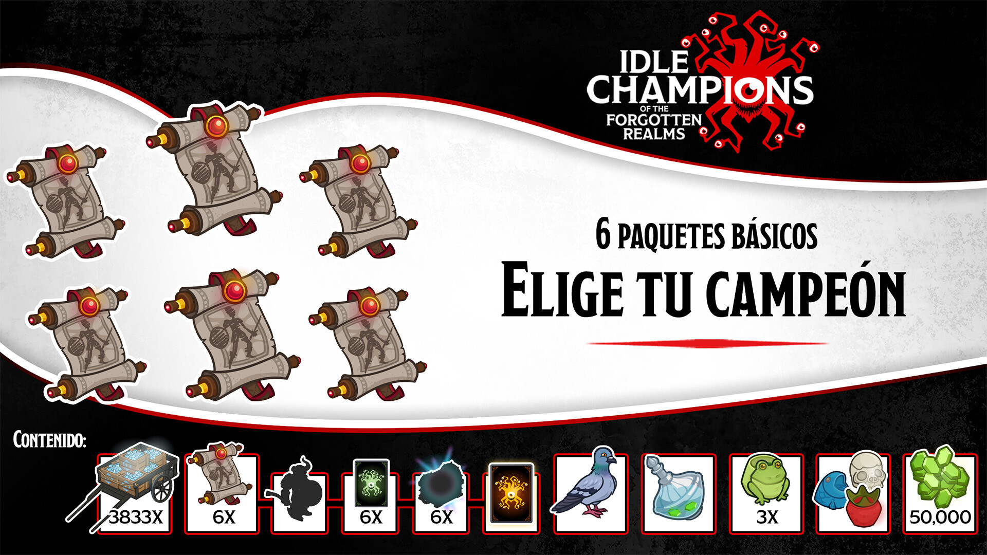 - 6 pergaminos de invocación de campeón que te permiten elegir al campeón que desbloquearás y obtener 6 cofres de platino, un épico dorado y el equipamiento poco común completo para los campeones elegidos.