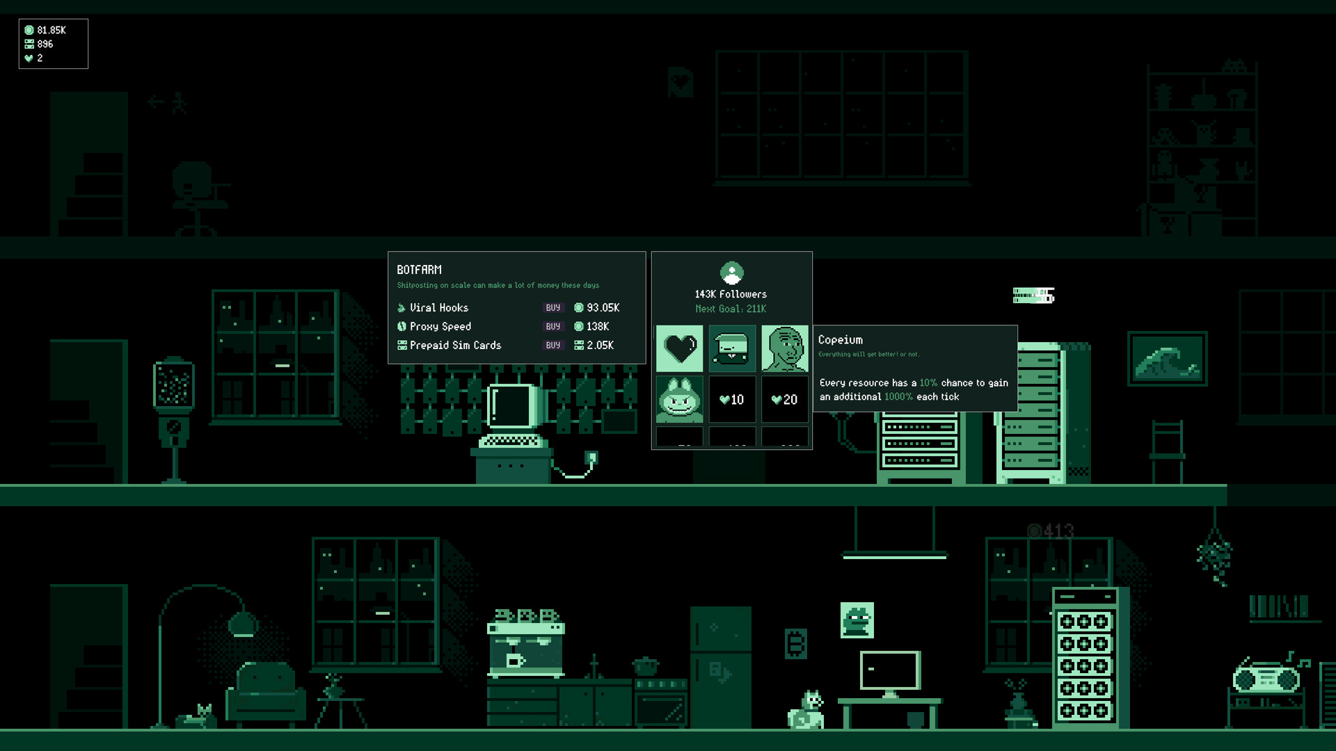 Progression brings new effects, not just higher numbers. Every station in the game features unique resources and mechanics that evolve as you grow - from your Computer stacking game-breaking combo effects, to rallying followers with the Botfarm to manipulate social consensus, or managing Peanut - a squirrel who generates clean energy... until he evolves and starts shooting lightning all over the room!