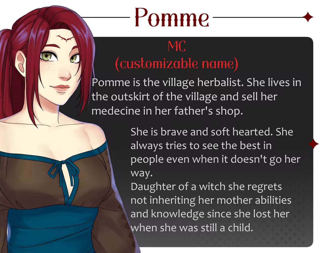 The Demon's Apple is a Dark Fantasy otome game with mature content. Pomme, a herbalist as to make an alliance with a bloodthirsty demon she saved to survive in a world hostile to both. Play as Pomme who has to learn to live under the same roof as the demon who wants her blood and more.