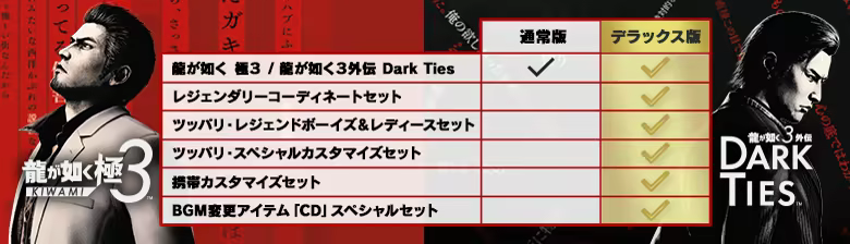 ※本コンテンツをご利用いただくには、別売りの『龍が如く 極3 / 龍が如く3外伝 Dark Ties』本編が必要です。また、最新版パッチ適用が必要な場合はアップデートの上、ご利用ください。