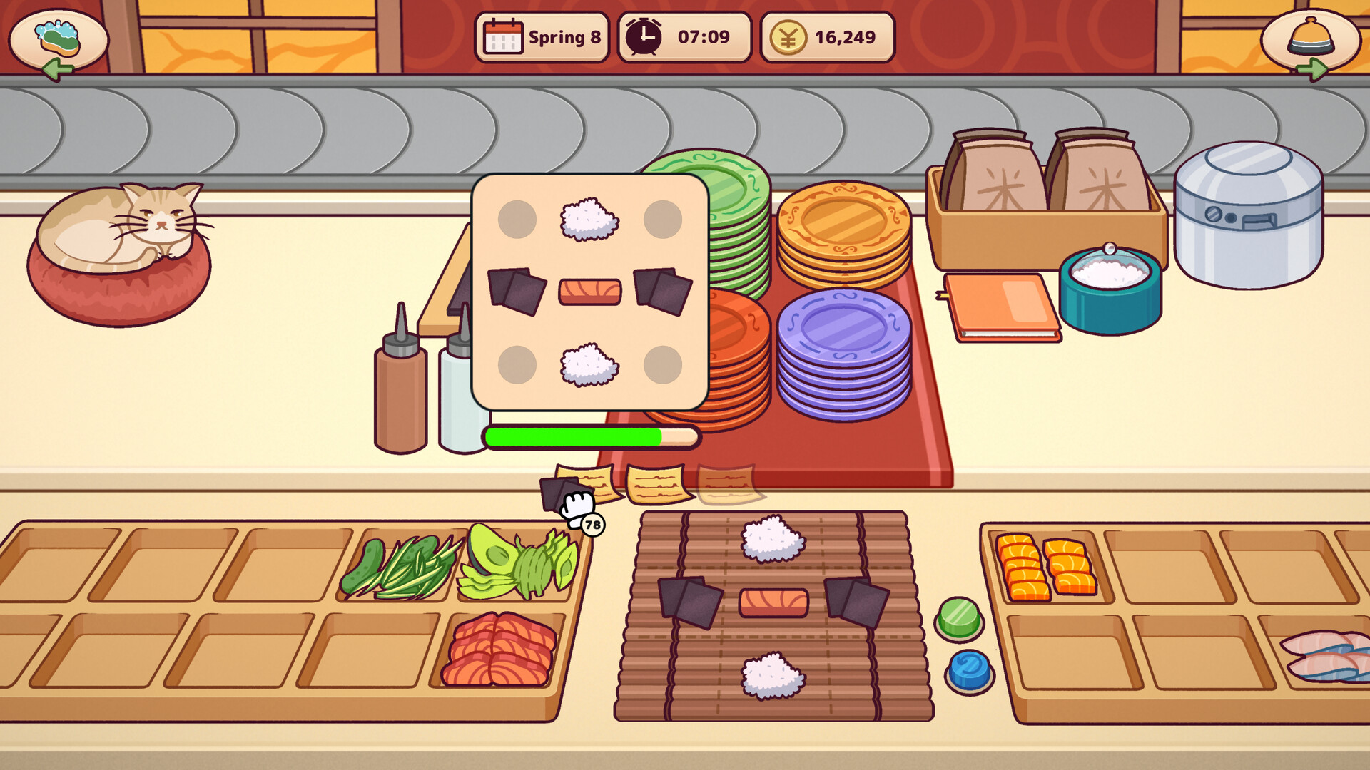 As the conveyor belt rolls on, so does your journey. Slice, roll, and plate a growing variety of delicious Japanese dishes, serve your customers with care, and grow your reputation one satisfied guest at a time.