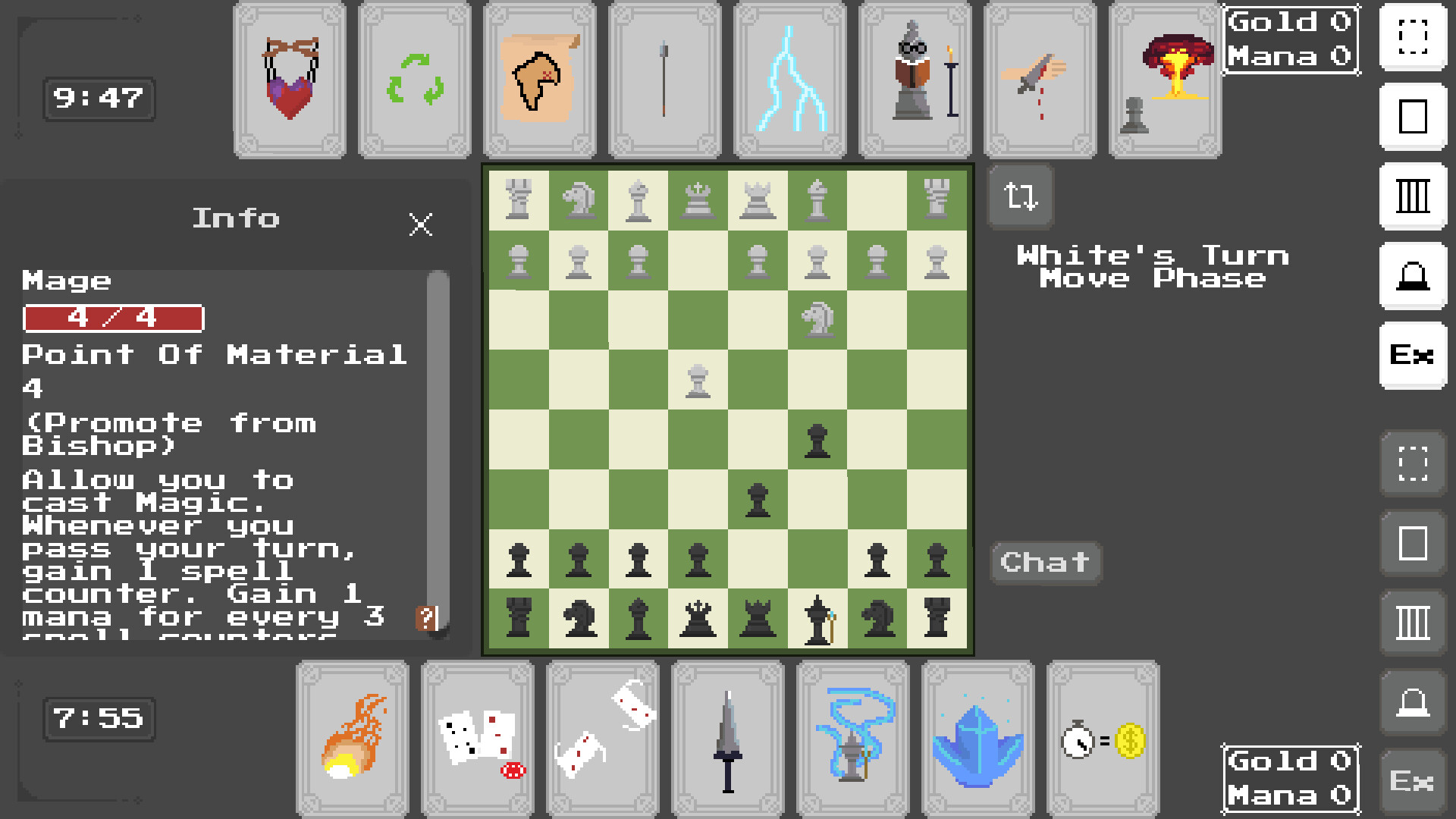 Extra pieces that aren’t part of standard chess are introduced into the game, you can get them by using card effect or promoting. Use these cards and pieces to craft your own strategy and defeat your opponent.