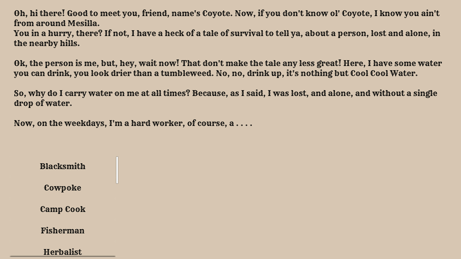 In Cool Cool Water, use your wits, your foraging skills, and your sheer grit to ensure that you  survive after waking up in the desert of southern New Mexico.