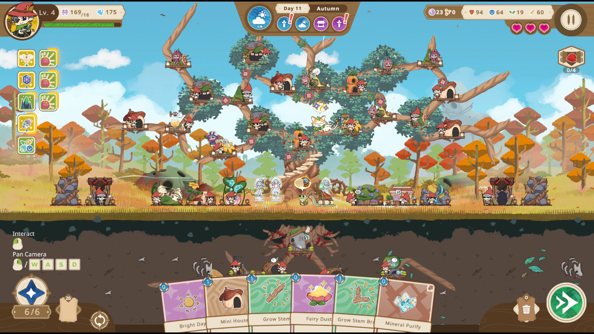 Build a gnome kingdom among the branches of a giant tree in this relaxing mix of city-building and roguelike deckbuilding. Grow the tree, build structures, earn cards and blessings, and survive monsters and disasters. Each run spans seasons and unfolds differently. Can your tree kingdom thrive?