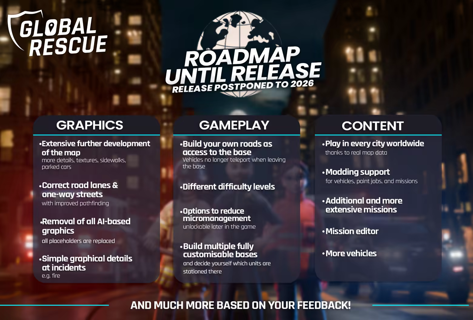 In Global Rescue, you take command of building and operating your own emergency services base. Coordinate missions, manage personnel and vehicles, customize your base — and take on the thrilling day-to-day operations of various first responder units: fire department, police, EMS, and even SWAT.