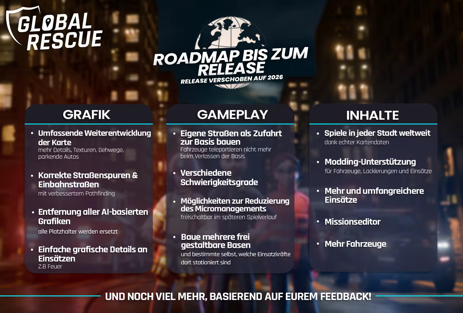 In Global Rescue übernimmst du das Kommando über Aufbau und Betrieb deiner eigenen Basis. Koordiniere Einsätze, verwalte Personal und Fahrzeuge, gestalte deine Basis nach deinen Vorstellungen – und meistere den spannenden Alltag unterschiedlichster Einsatzkräfte: von Feuerwehr, Polizei und Rettungsdienst bis hin zur SWAT-Einheit.
