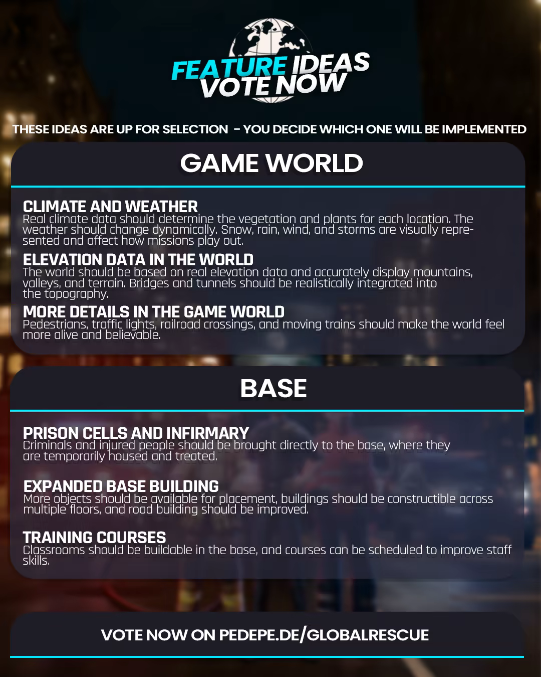 У грі Global Rescue ти береш на себе командування будівництвом і управлінням власною базою. Координуй операції, керуй персоналом і технікою, створюй базу на свій смак – і опановуй насичене повсякденне життя служб порятунку: пожежної, поліції, швидкої допомоги та SWAT. Завдяки реалістичним картографічним даним ти можеш вільно обирати місце для бази – у рідному місті чи будь-де у світі.