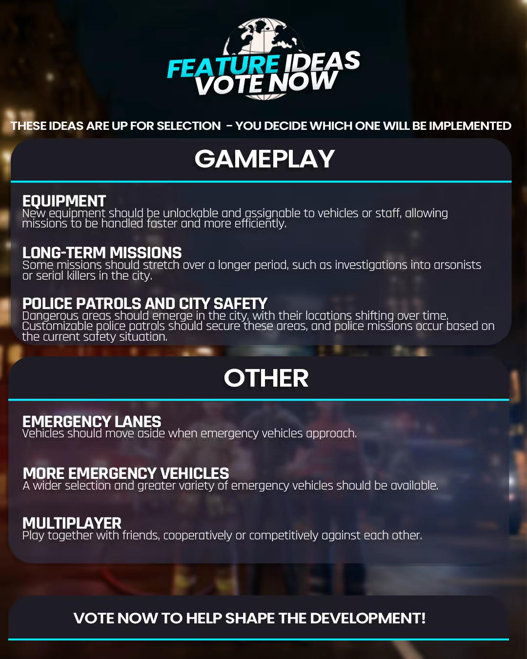 У грі доступний великий вибір спецтехніки поліції, пожежної служби, швидкої допомоги та SWAT. Сформуй автопарк із 19 детально змодельованих машин – у класичному стилі або з кастомними кольорами.