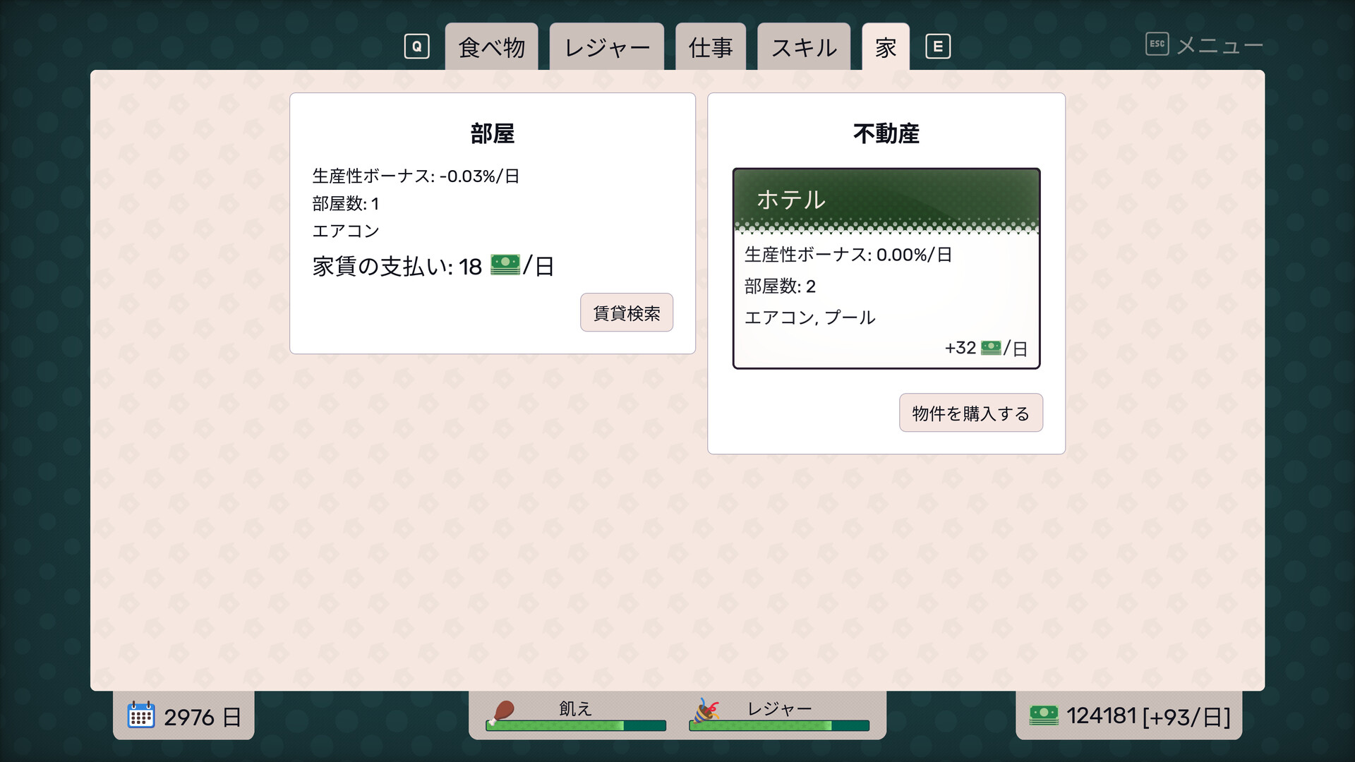 基本欲求を満たそう。8つの料理ジャンルから20種類以上の料理を選んで空腹をしのげ。ただし注意——退屈で死ぬこともある(おすすめしません)!