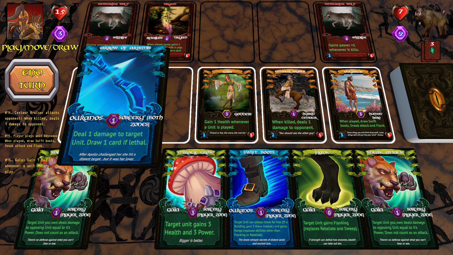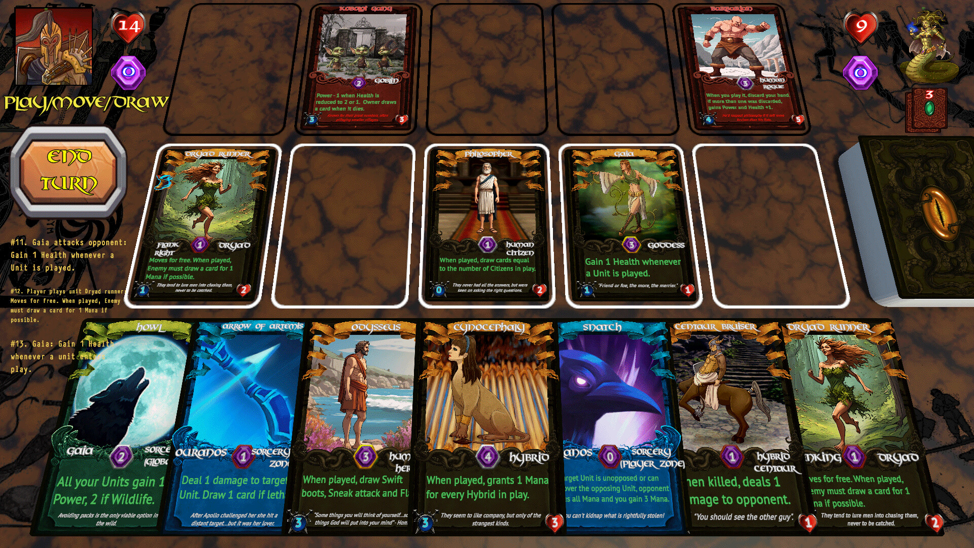 This single player deckbuilding game with a light Greek mythology theme has over 250 cards to collect by defeating enemy hordes with superior tactics through positioning and well timed sorceries. Unlock almost 40 different deck types with their own particular strategy and a plethora of card combos.