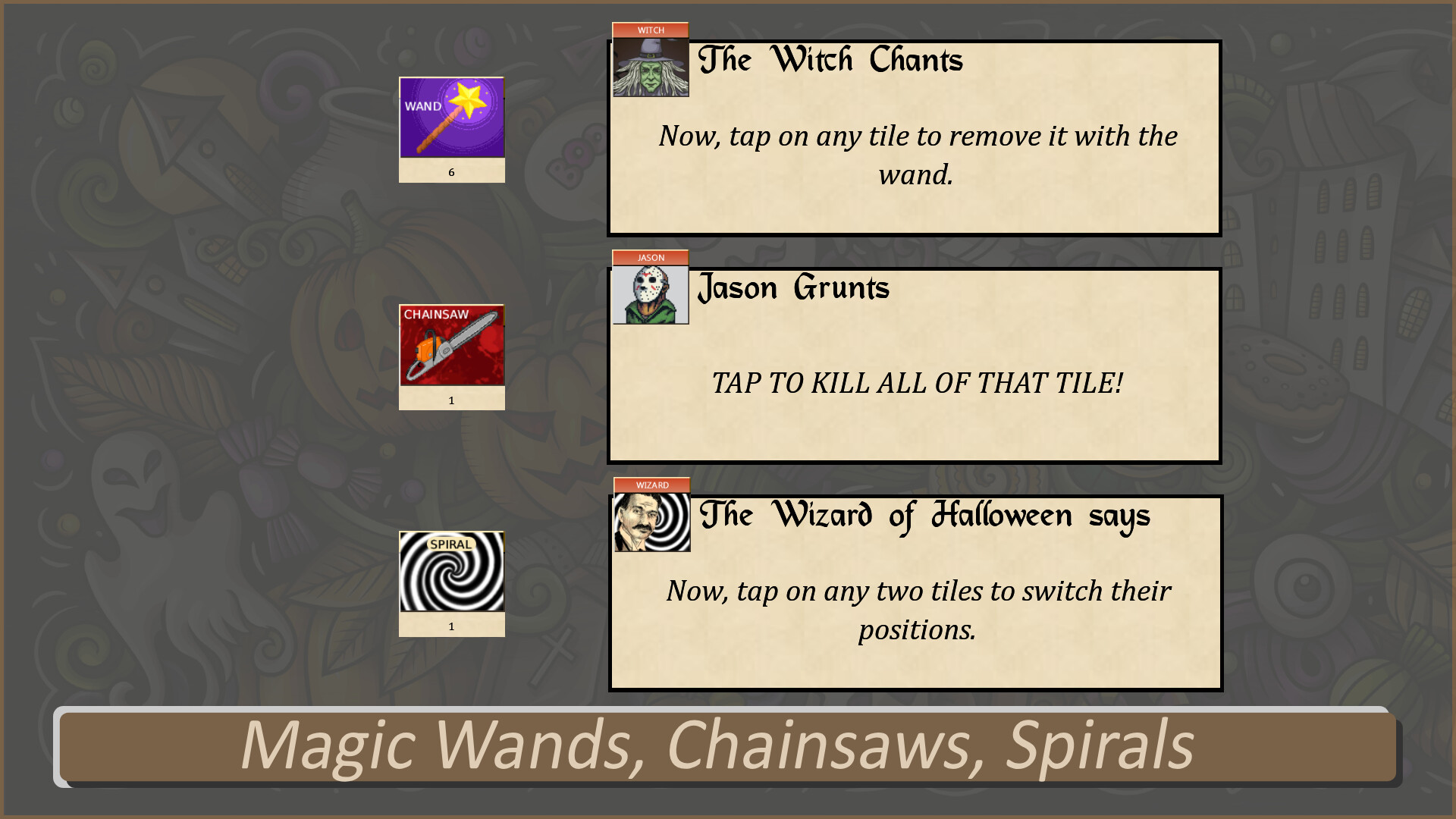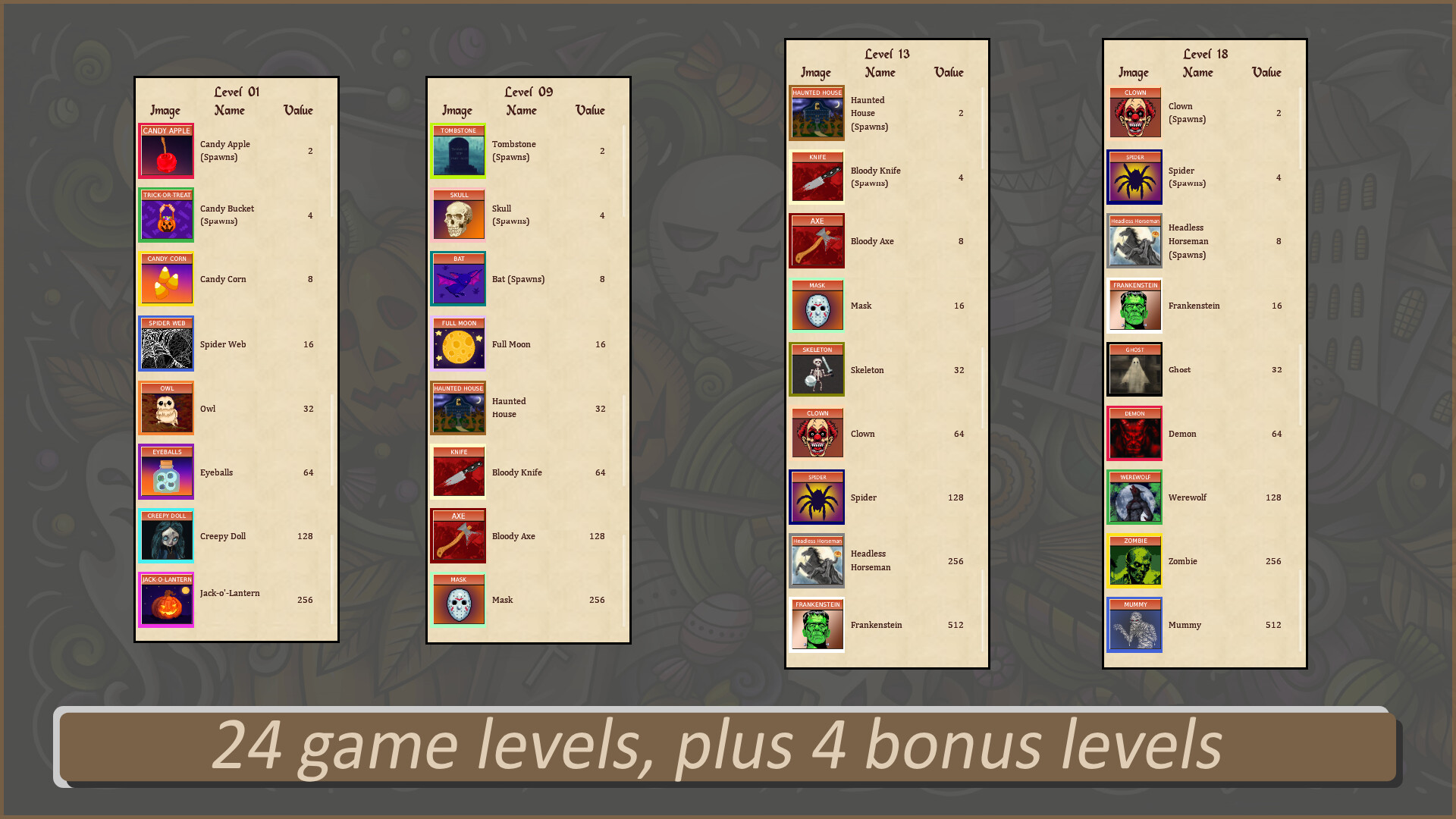 Halloween 2048 is a Halloween themed tile merge game based on the classic puzzle with the goal of reaching the top tile at each level, progress through all 28 levels and reach All Saints Day. You move tiles around the board using either your mouse, keyboard or controller and when two, three or more tiles of the same type touch, they merge into one and give you points. You earn bonus actions for merging more than two tiles in a row and completing levels. Bonus actions are tapping a tile to remove it, tapping a tile to remove all of that tile type, switching tile positions or even increasing the board size. The game includes two difficulty levels; normal and hard. Earn achievements for completing top levels, and climb the two different difficulty leaderboards.