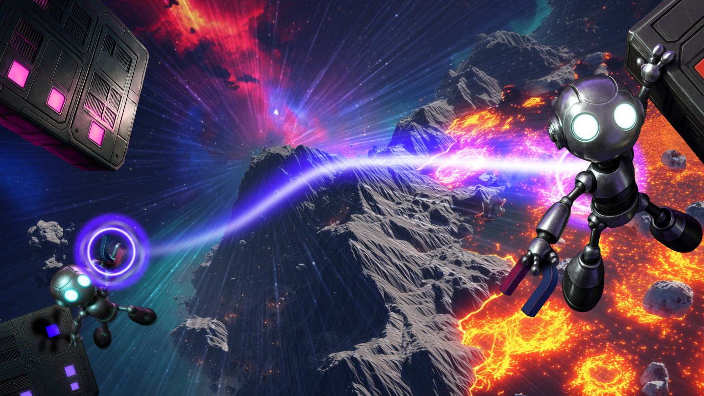 Every movement is shared. Pull a teammate toward safety, and they might pull you off a ledge. Vault across a gap, and you might send your friend spinning into orbit. The magnetic tether is both tool and trap, turning every jump, swing, and climb into a test of coordination, timing, and trust.