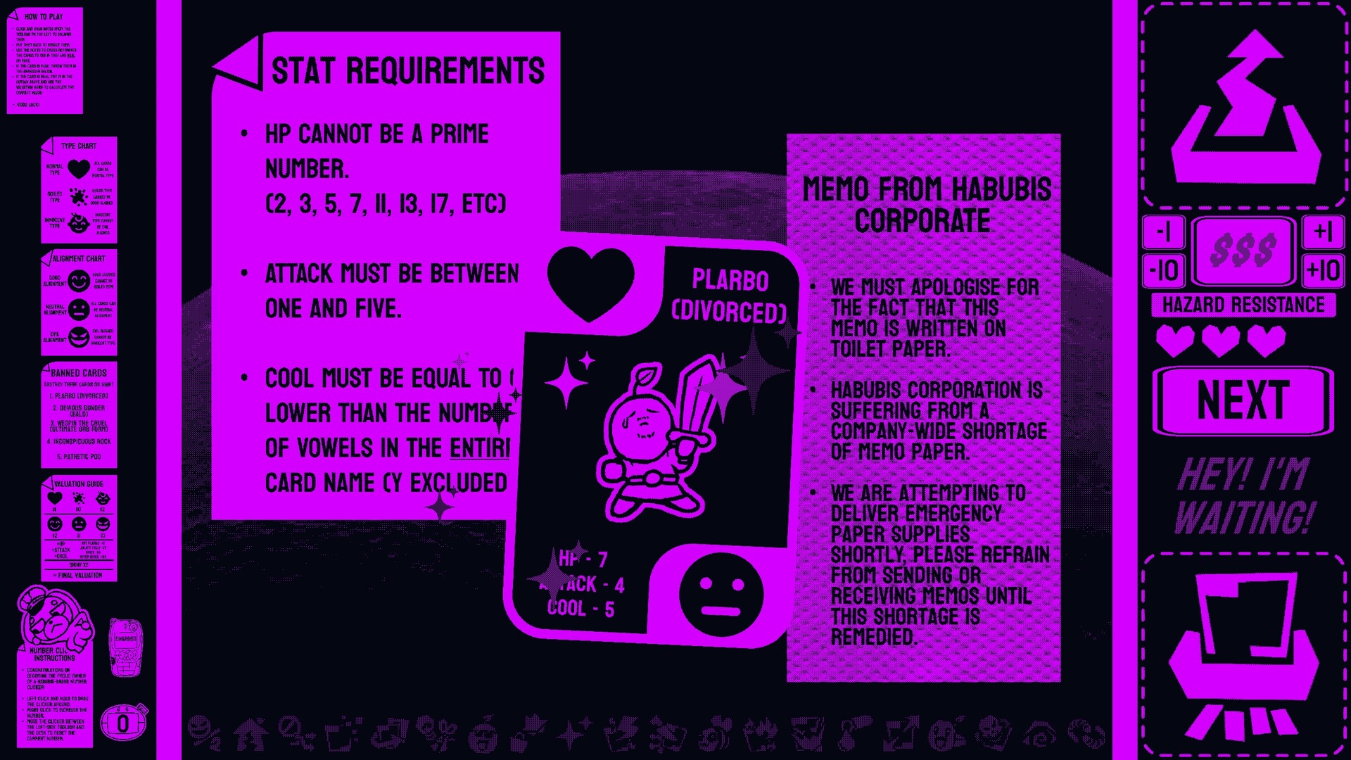 Inspect your way through dozens of unique, hilarious cards in this chilled-out papers-please-em-up! Identify and appraise cards from The World's Most Coolest TCG! Start your new job as an official Habubis Trading Card Inspector and uncover a tale of friendship, corporate espionage and murder?!