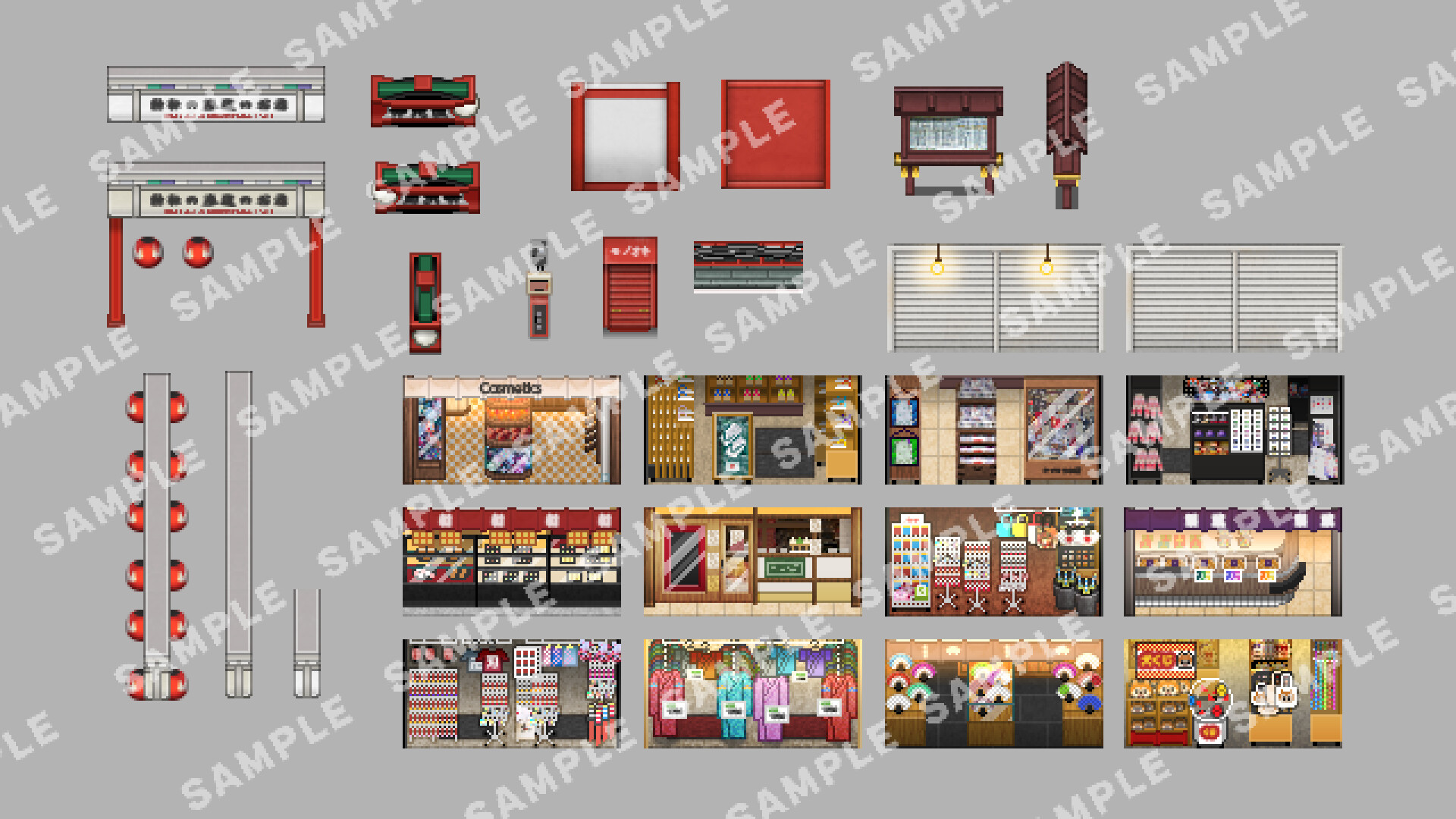 • Tile B: Buildings, roofs, shop exteriors, lanterns, bulletin boards, stone lanterns, fences, pillars, etc.