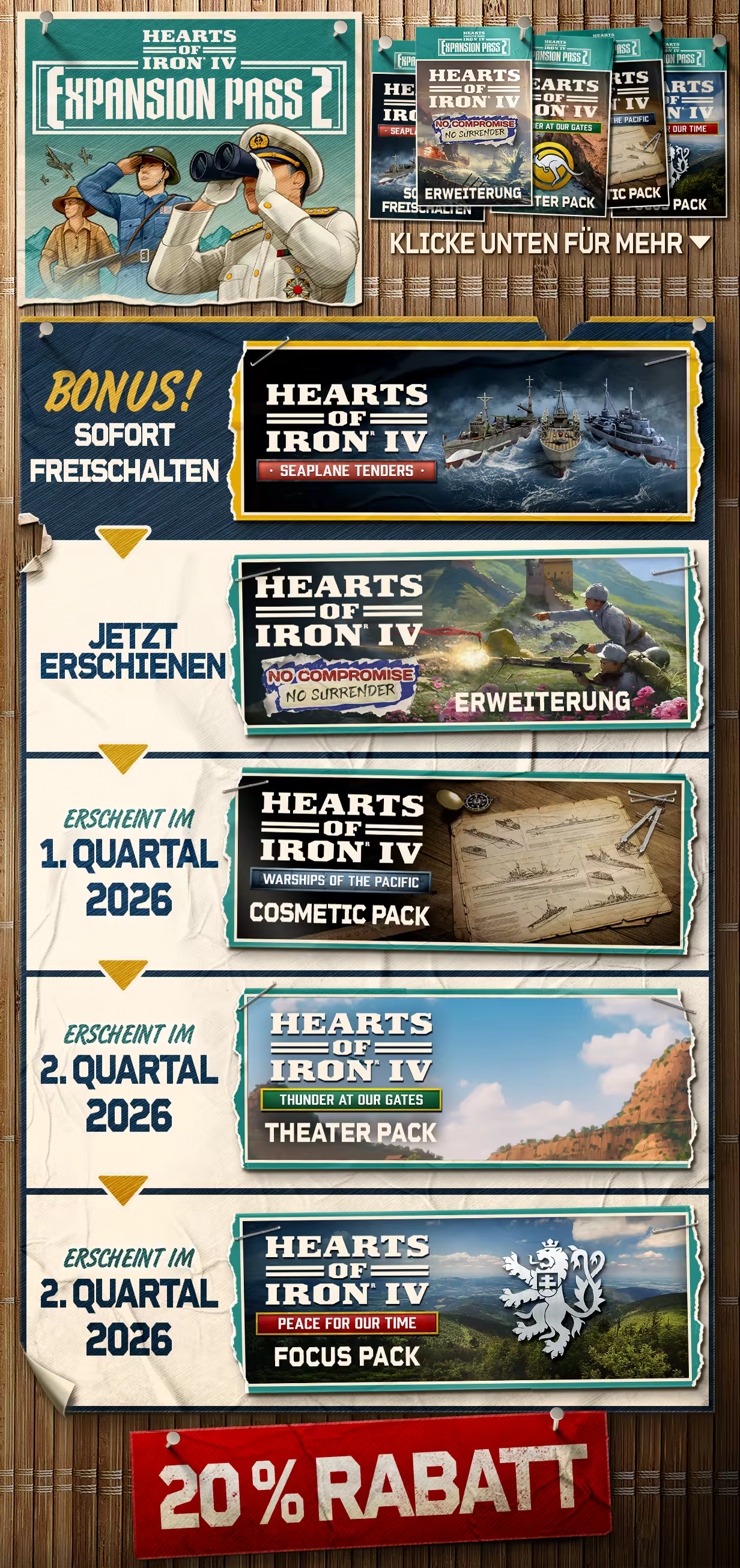 Für eine geringe monatliche Gebühr erhältst du Zugriff auf alle Erweiterungen und Länder-Erweiterungen von Hearts of Iron sowie auf besondere kosmetische Inhalte, Musik und Audiopakete. Dieses Abonnement wird automatisch aktualisiert, um auch zukünftige Add-ons für Hearts of Iron zu umfassen.