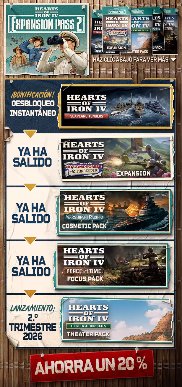 Por una reducida tarifa al mes, disfruta de todas las expansiones y complementos de país de Hearts of Iron, además de un montón de contenido cosmético especial, música y paquetes de sonido. Actualizaremos la suscripción para incluir los complementos de Hearts of Iron que vayan saliendo en el futuro.