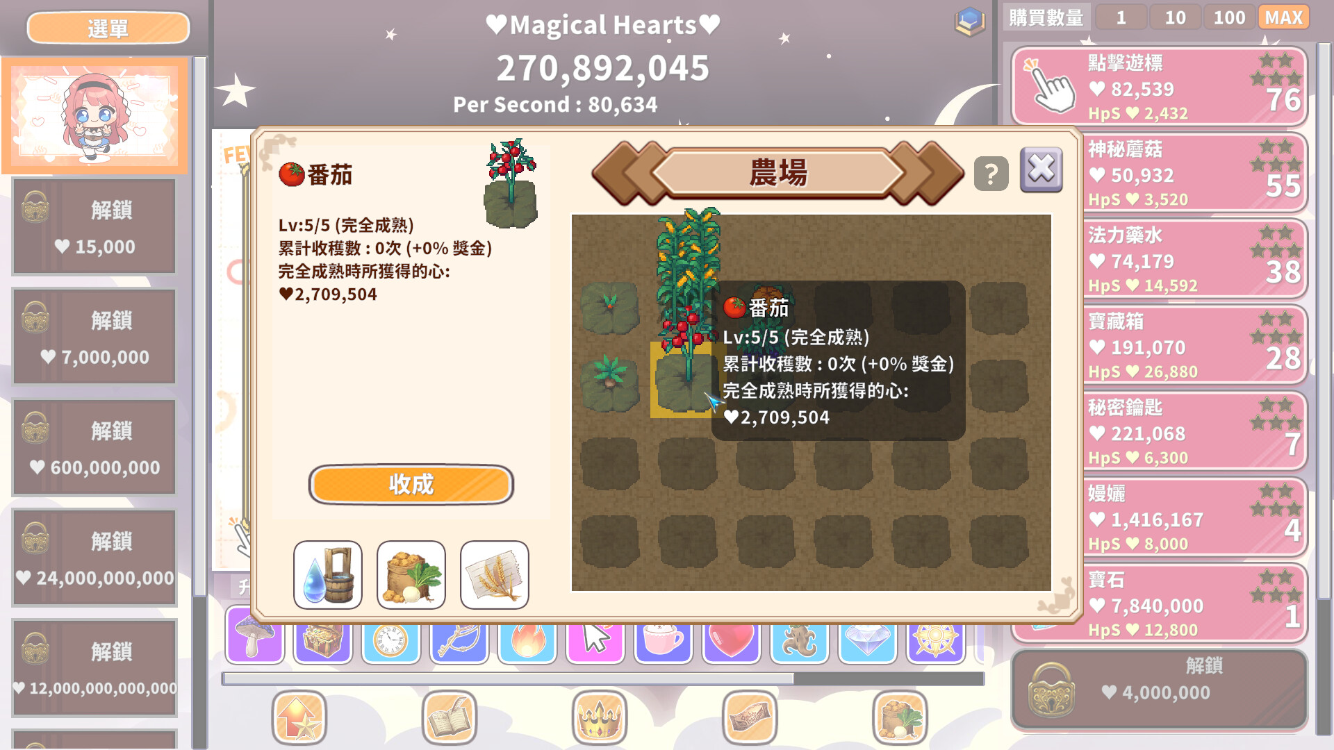 Farm: Spend hearts to grow crops and harvest them. Crops will strengthen your productivity while growing!
