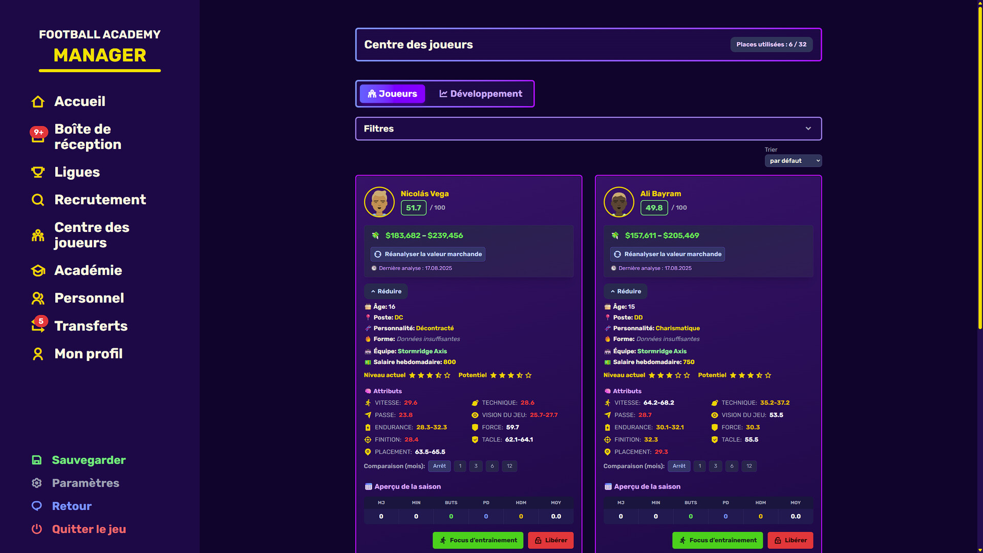 • Vendre des joueurs — place tes diplômés dans des clubs intéressés et finance la prochaine génération.