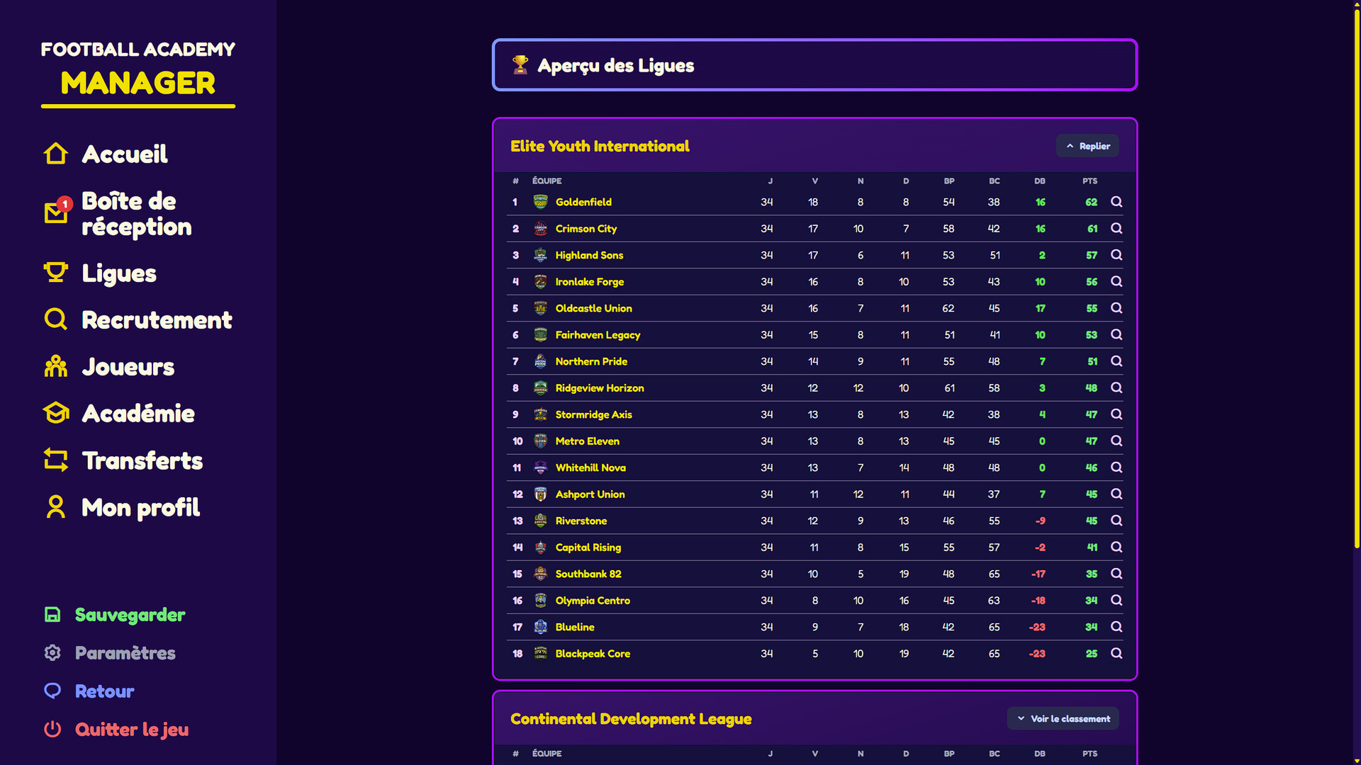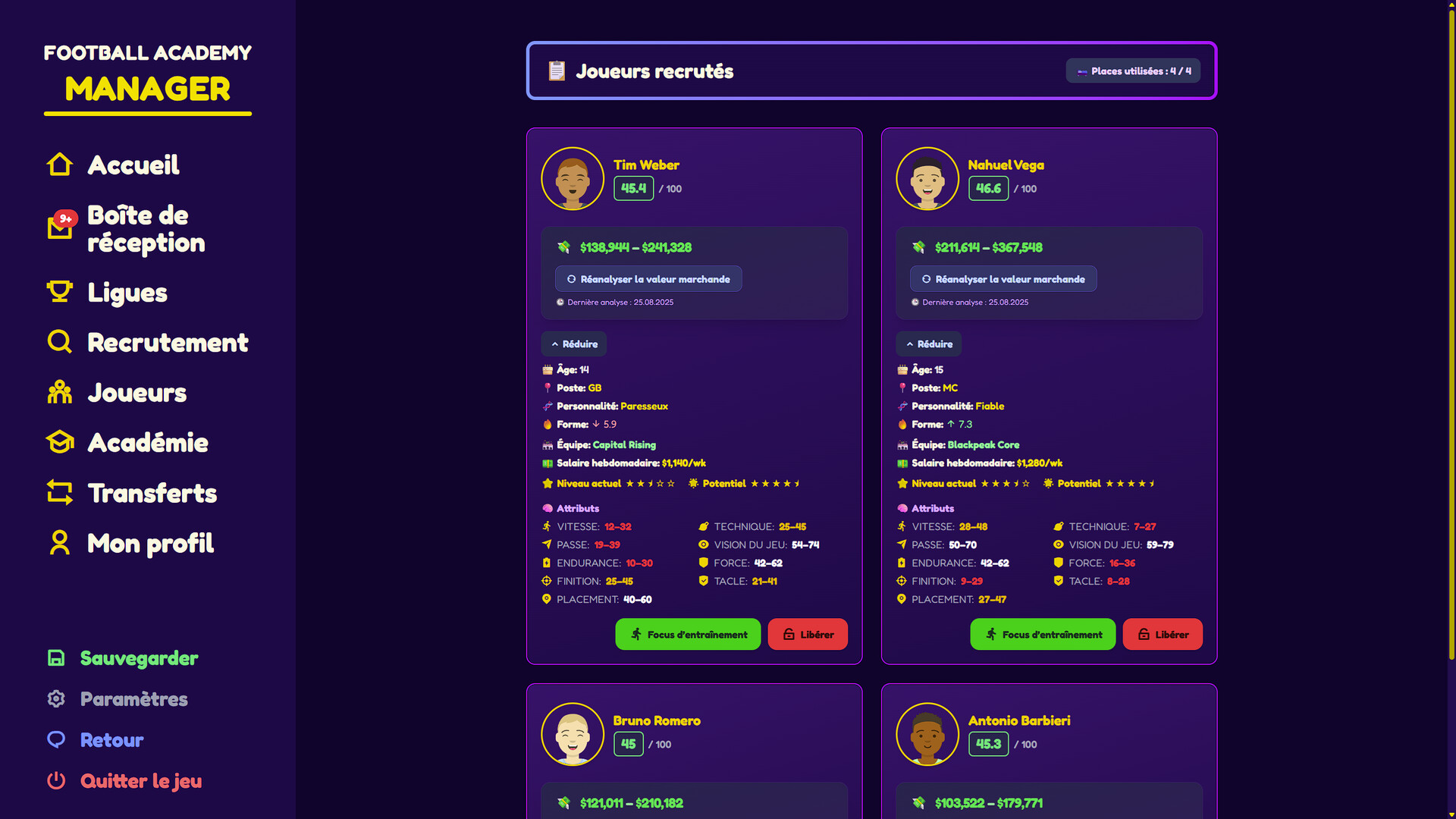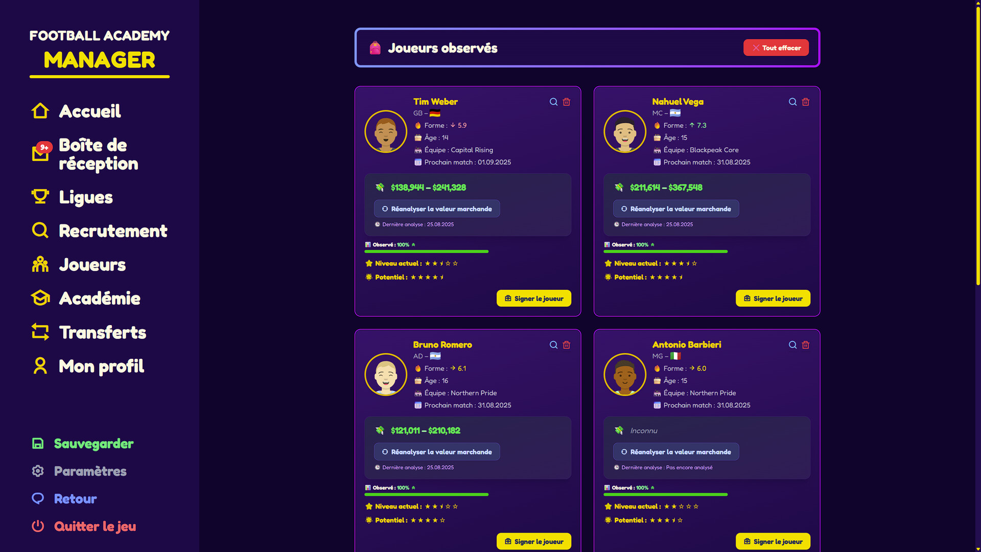 • Vendre des joueurs — place tes diplômés dans des clubs intéressés et finance la prochaine génération.